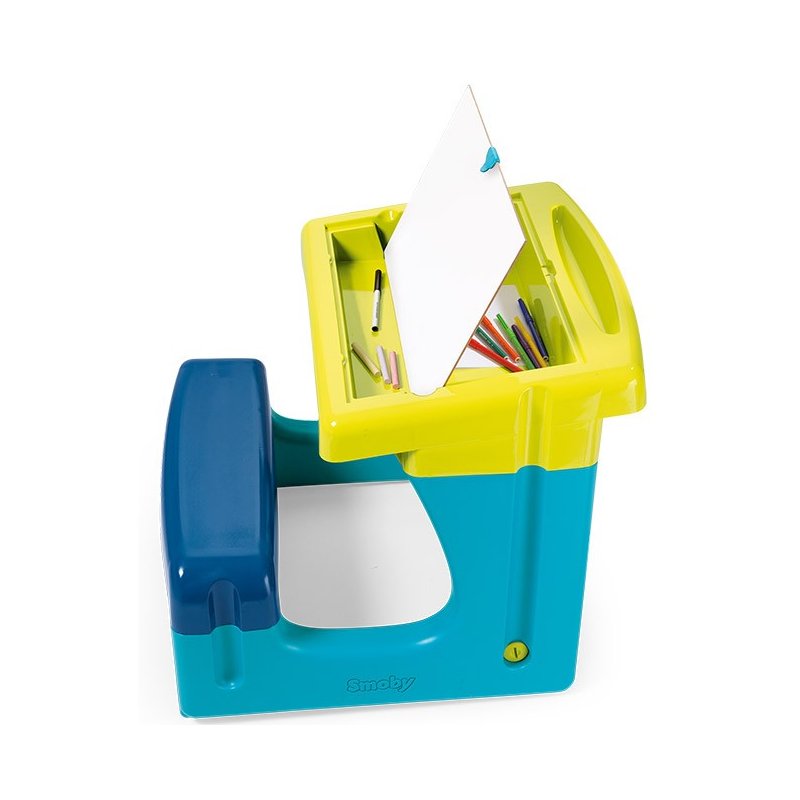 Stolik z ławka do siedzenia renomowanej francuskiej firmy Smoby utrzymany jest w żywej kolorystyce. Niebieskie siedzisko podtrzymywane jest przez błękitną konstrukcję. Obudowa dwustronnej tablicy do pisania kredą oraz pisakami w kolorze jasnej zieleni. Całość wykonana z wysokiej jakości tworzyw to ciekawa propozycja kreatywnej zabawy dla dzieci. Dla pełnej wygody biurko posiada podnóżek .Stolik posiada bardzo przydatny schowek (pod składaną tablicą) do którego można schować markery i kredę, bądź dzieła które się stworzyło. W zestawie 2 specjalne flamastry oraz 6 kolorowych kred.