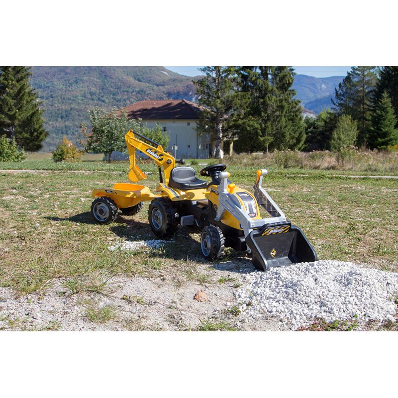 Traktorek posiada napęd na pedałki (mechanizm łańcuchowy) oraz skrętną przednią oś, za pomocą której dziecko może kierować całym zestawem. Dodatkowo został wyposażony w przyczepę jednoosiową oraz koparkę z tyłu i łyżkę z przodu, które urozmaicą dzieciom zabawę.