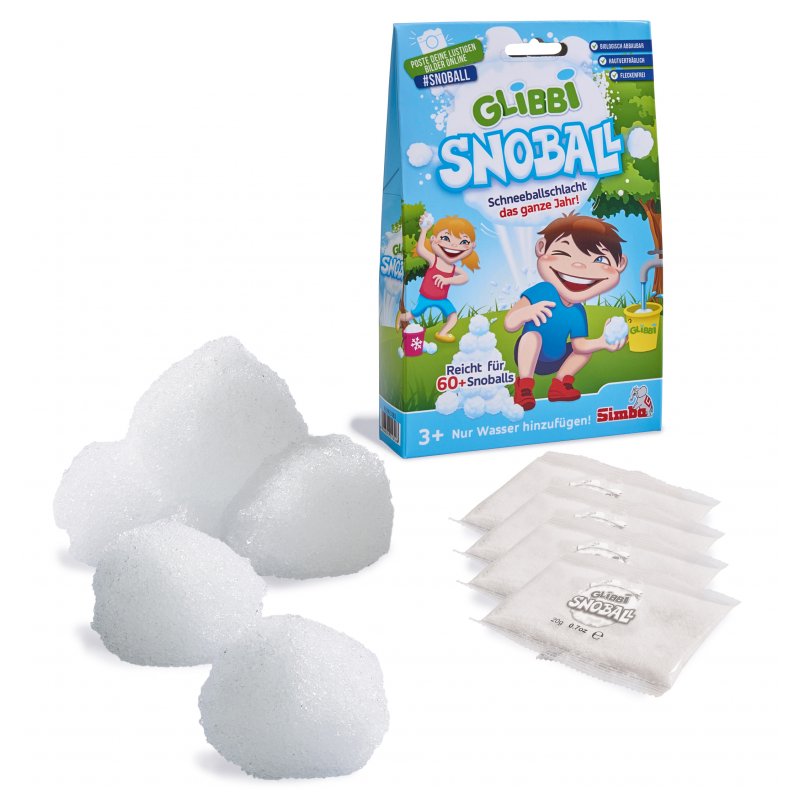 Glibbi Snoball nowa zabawa od cenionego producenta firmy Simba. Zestaw 4 woreczków z proszkiem ( każdy z nich po 20 g) wystarczy na utworzenie ponad 60 kulek ze sztucznego śniegu. Wystarczy, że zmieszasz biały proszek z wodą (załączono instrukcje w języku polskim) i uzyskasz sztuczny śnieg, z którego uformujesz śnieżki. sztuczny śnieg jest zupełnie biodegradowalny,niebrudzący i przyjazny dla skóry.