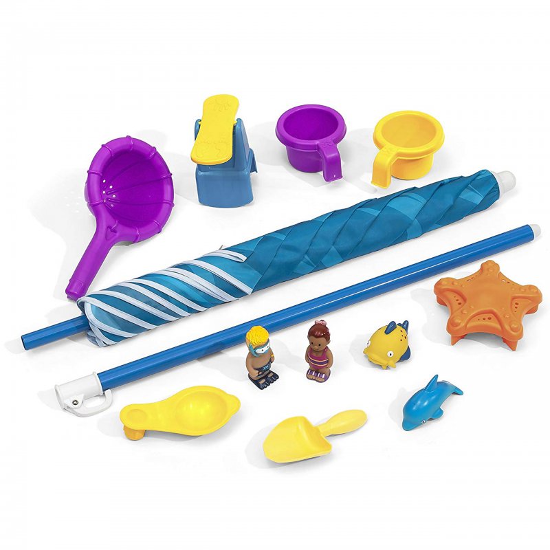 • Akcesoria do zabawy w zestawie: sitko, deska do skoków, do wody, 3 kubeczki, 4 figurki, spinner wodny rozgwiazda.