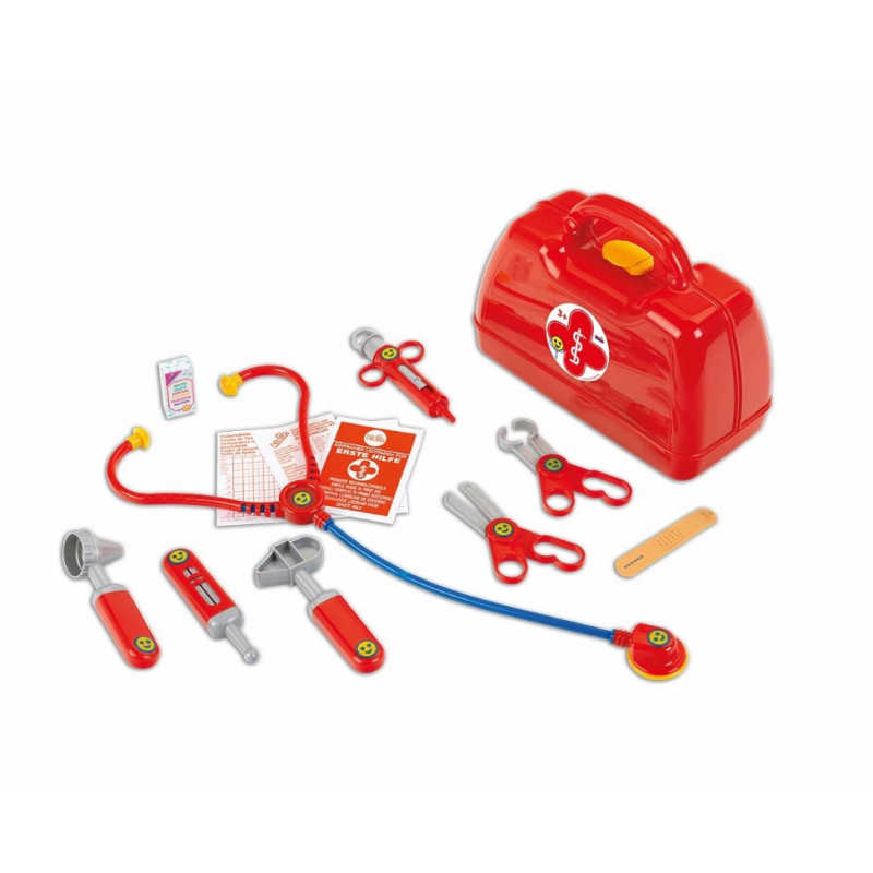 Zestaw w walizeczce o trapezowym kształcie zawiera podstawowe, niezbędne wyposażenie każdego medyka. Czerwona walizeczka wykonana jest z bardzo trwałego tworzywa, posiada wygodny uchwyt do noszenia oraz żółty klips, który zabezpiecza ją przed otwieraniem się. Ten zestaw zawiera aż 10 elementów. Wszystkie są oczywiście bezpieczne dla dzieci i proste w użyciu.