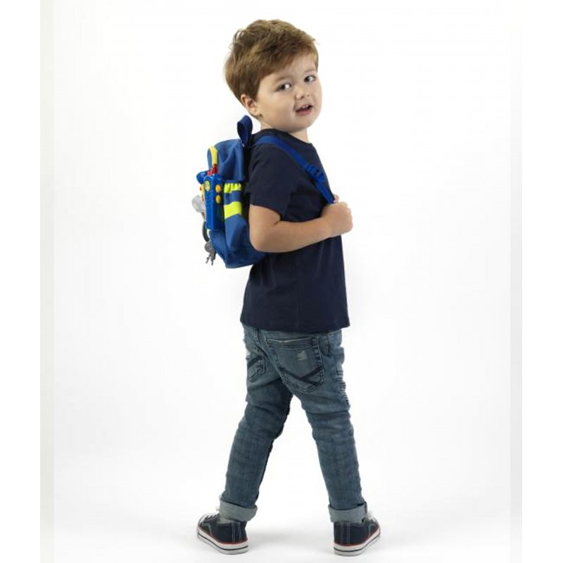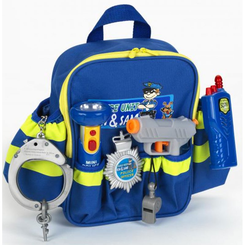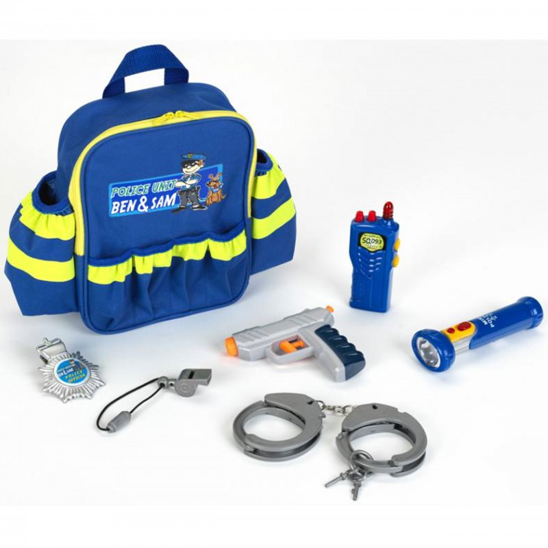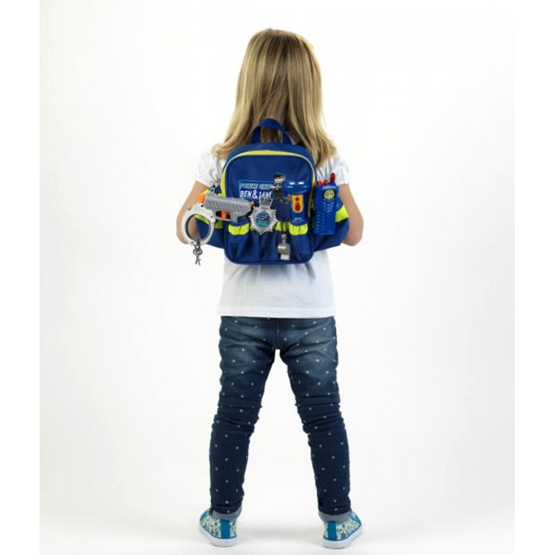 Plecak zachowany jest w kolorystyce niebieskiej z wizerunkiem Ben and Sam. Po bokach plecaka oraz z przodu znajdują się kieszenie na przybory policyjne. Dodatkowo plecak dookoła posiada żółty materiał odbijający światło, dzięki czemu Twoje dziecko będzie bezpieczne podczas spacerów. Wszystkie akcesoria dołączone do zestawu są bezpieczne dla dzieci. Zestaw pozwoli Twojemu dziecku wcielić się w policjanta, co z pewnością dostarczy mu niezliczone godziny świetnej zabawy. Plecaczek posiada regulowane szelki.