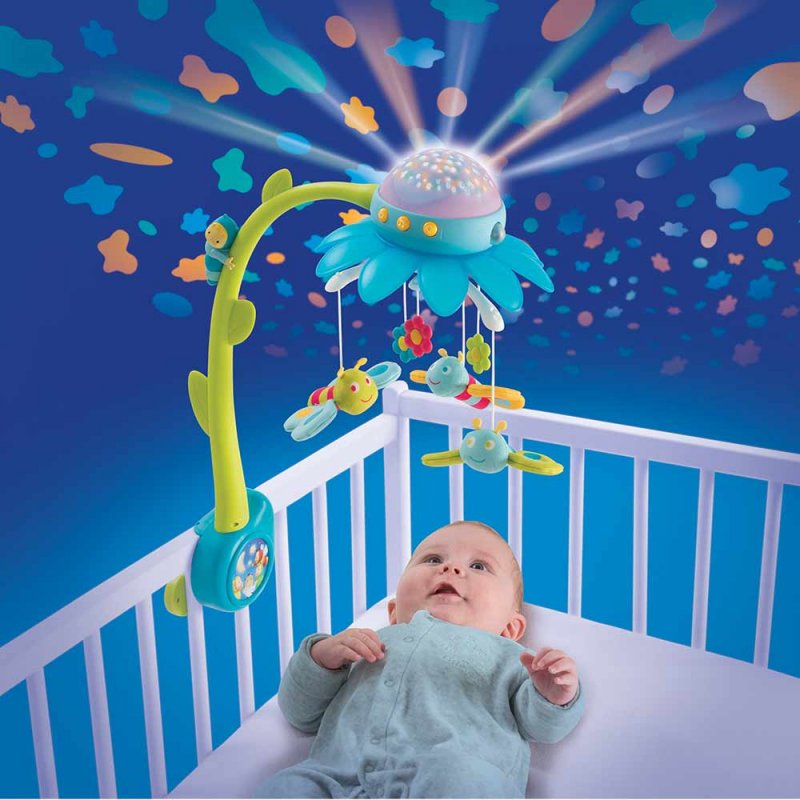 Karuzelka mocowana do łóżeczka z możliwością projekcji kolorowych kwiatków oraz motylków na suficie sypialni zapewni przyjemny sen Twojej pociesze.Pałąk w formie łodygi wieńczy projektor w kształcie kwiatu, prosty w obsłudze pilot..