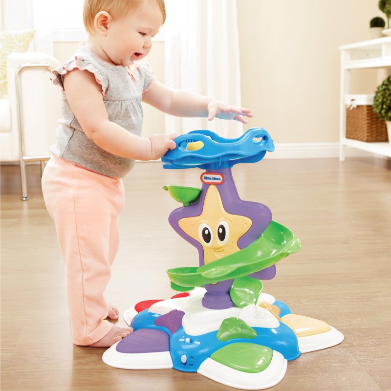Wesoła rozgwiazda zaprasza dzieci do zabawy w morskim klimacie. Cztery kolorowe piłeczki toczą się po spiralnej zjeżdżalni w towarzystwie dźwięków i świateł. Rozgwiazda zachęca dzieci do tańca i wstawania. Zabawka wzmacnia u dzieci rozwój motoryczny, uczy kolorów i pozwala na odtwarzanie dźwięków za pomocą aktywnych przycisków.