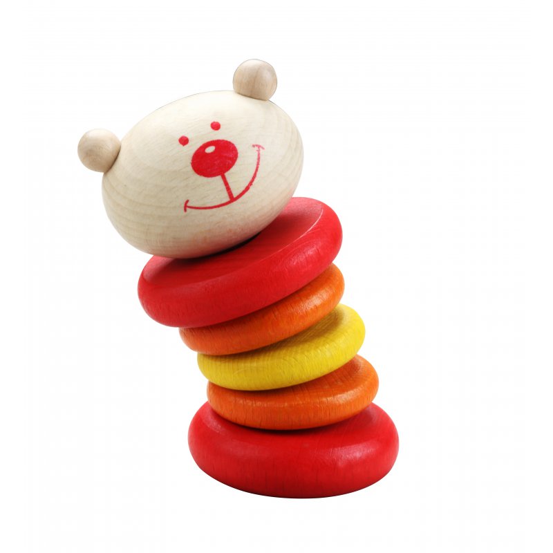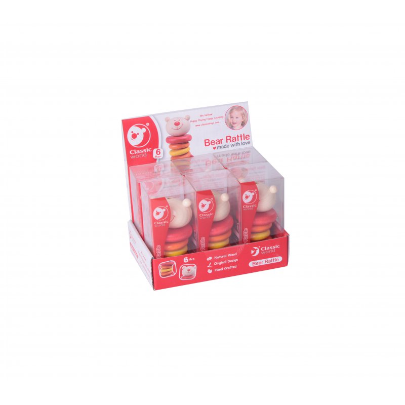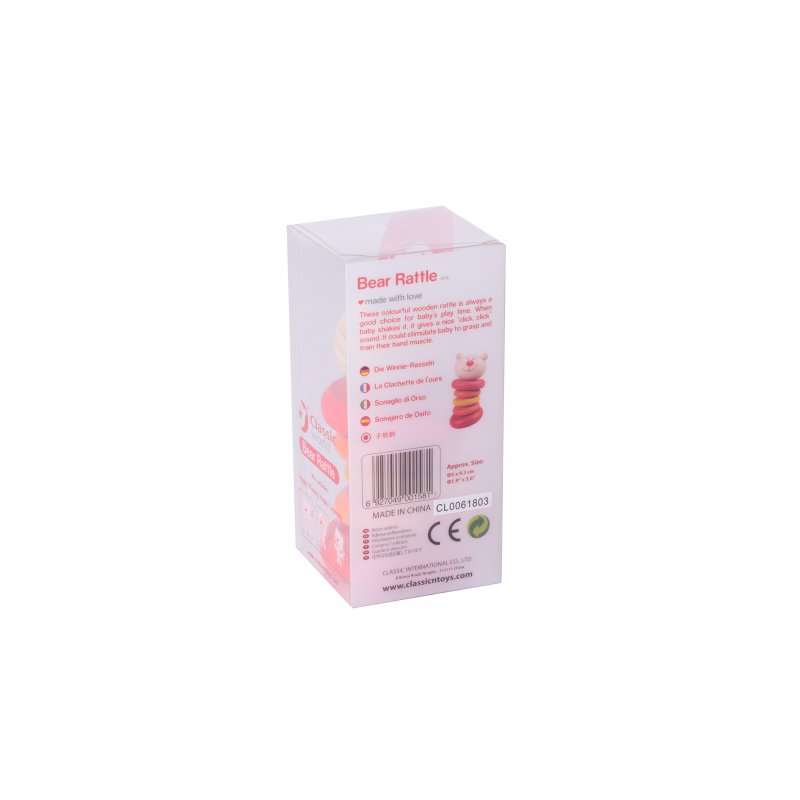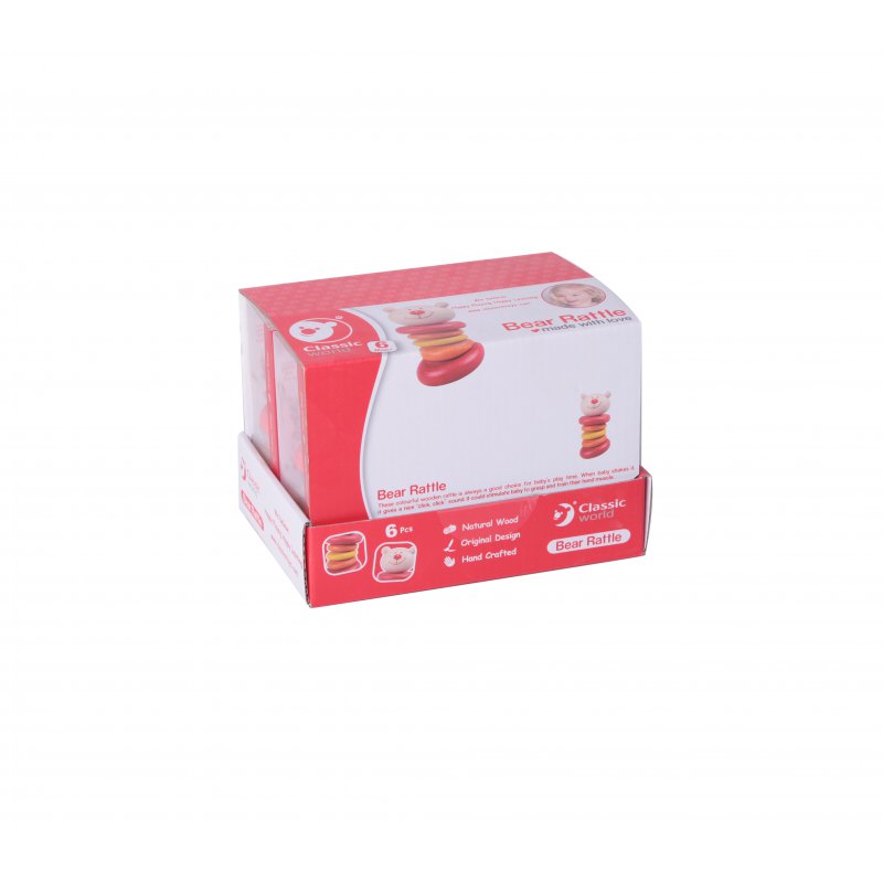 Czerwono - pomarańczowo - żółta grzechotka dla maluszków marki Classic World. Uśmiechnięty misio wykonany z wysokiej jakości drewna to idealny prezent dla 6 miesięcznego dziecka. Podczas potrząsania drewniane dyski uderzają o siebie i powodują przyjemne dla ucha grzechotanie.