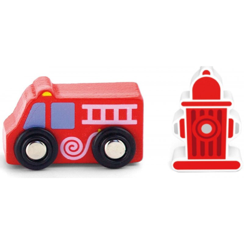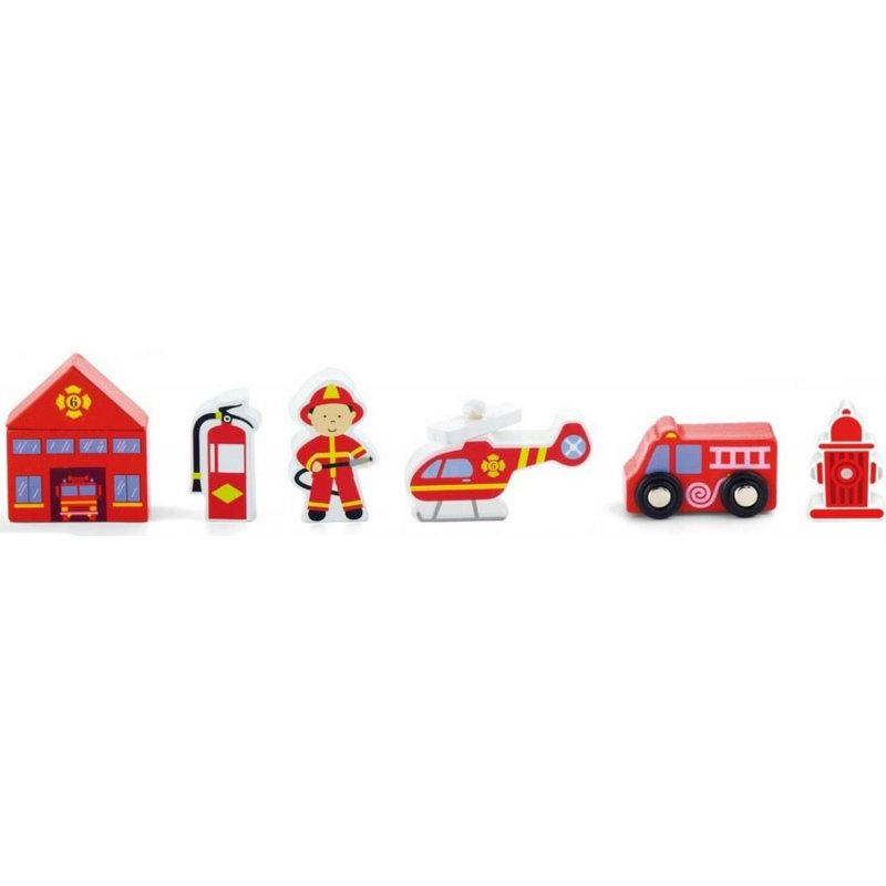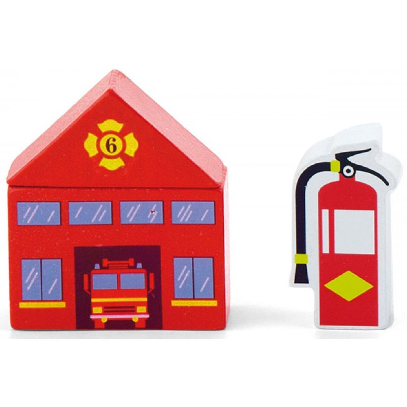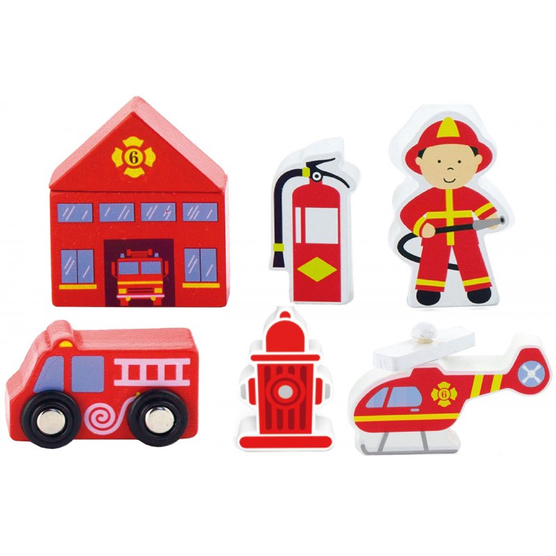 Komplet składa się z 6 elementów - hydrantu, gaśnicy, helikoptera, wozu strażackiego, remizy i strażaka. Komplet może być wykorzystany jako samodzielna zabawka, ale możemy go użyć również do uzupełnienia kolejki, innego kompletu klocków, czy drewnianej farmy.