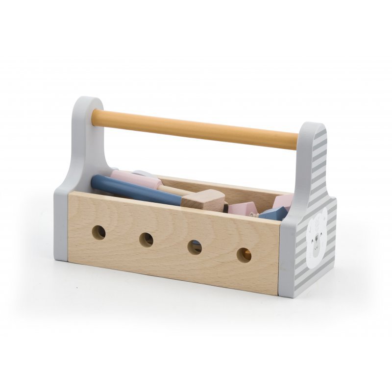 W skład naszego zestawu wchodzi klucz, młotek, 6 złączy, po 8 nakrętek i śrub oraz 4 gwoździe i specjalna składana skrzynka. Dzięki temu zestawowi, dziecko w bezpieczny i kontrolowany sposób może naśladować rodzica i nie narażać się na uraz.