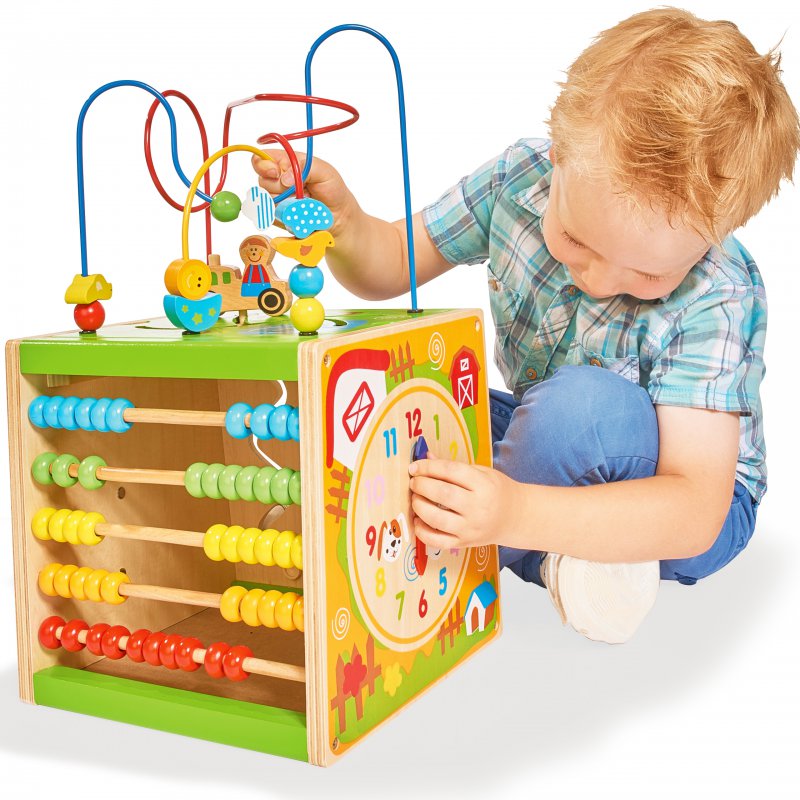 Duża, drewniana kostka manipulacyjna to bardzo praktyczna zabawka, w której każda ze ścian ma zupełnie inną funkcjonalność i charakter. Pozwala to na bardzo ciekawą zabawę, która szybko się nie znudzi i będzie stymulowała rozwój Twojego malucha.