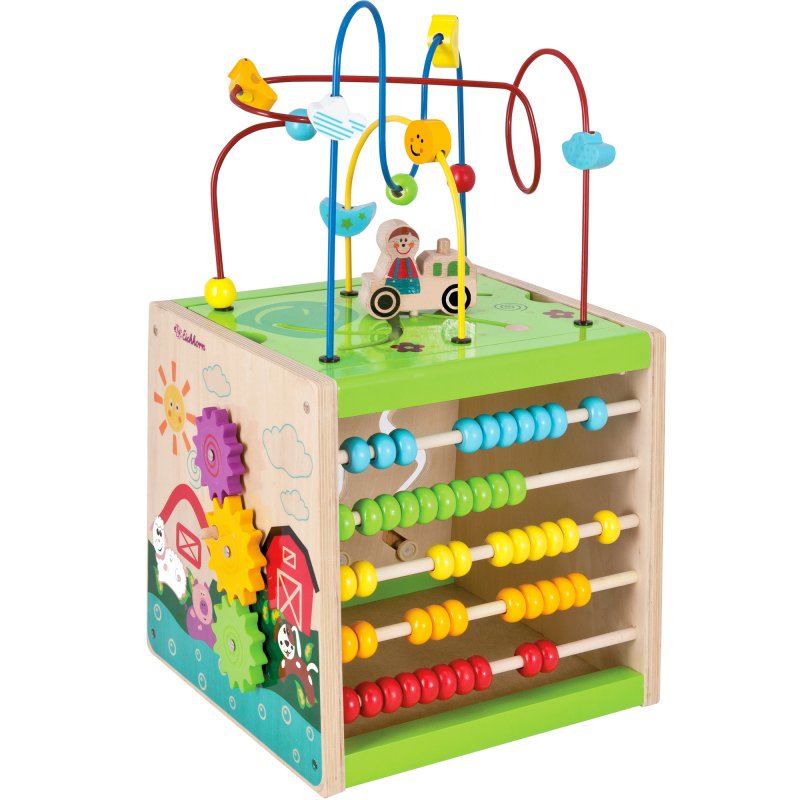 Każda ściana ma inną funkcję i angażuje dziecko na wiele sposobów. Na wieku znajduje się śliczna przeplatanka z trzema pręcikami i poruszającym się po podeście samochodzikiem. Istnieje możliwość obrócenia wieka i schowania przeplatanki wewnątrz sześcianu.