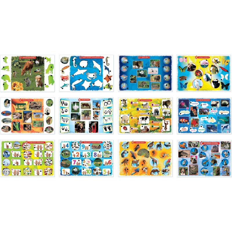 12 plansz z zagadkami: Jaki jest mój kształt?,Skojarz sylwetki z mieszkańcami morza,Gdzie żyją?,Jakiego są koloru?...