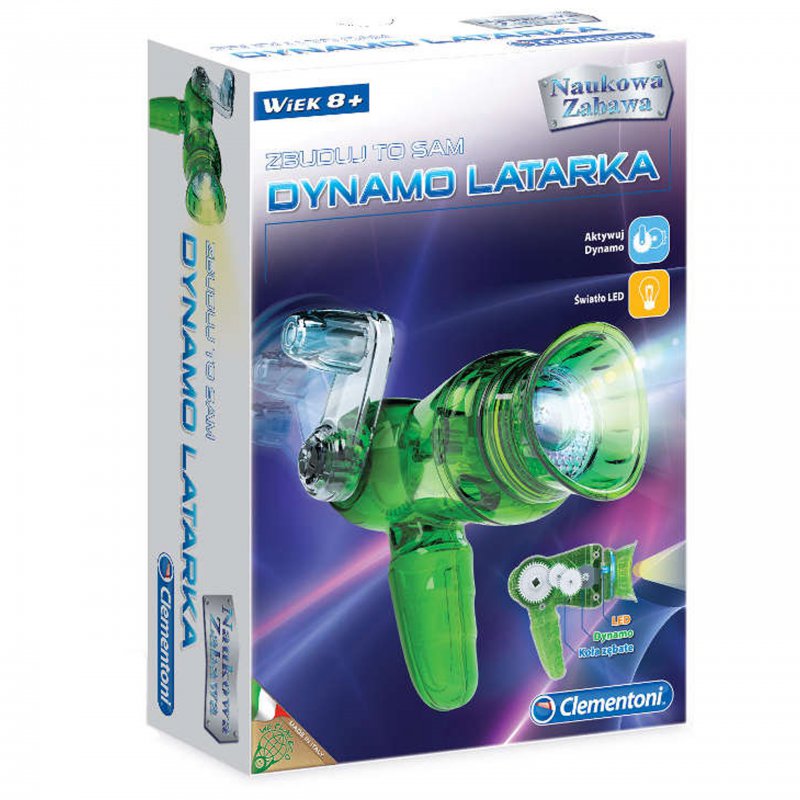 Zestaw Latarka - Dynamo zaprojektowany przez renomowanego producenta zabawek interaktywnych dla dzieci,włoską firmę Clementoni. Stwórz własną latarkę dynamo i odrywaj tajniki przekształcania pracy mechanicznej w prąd elektryczny.