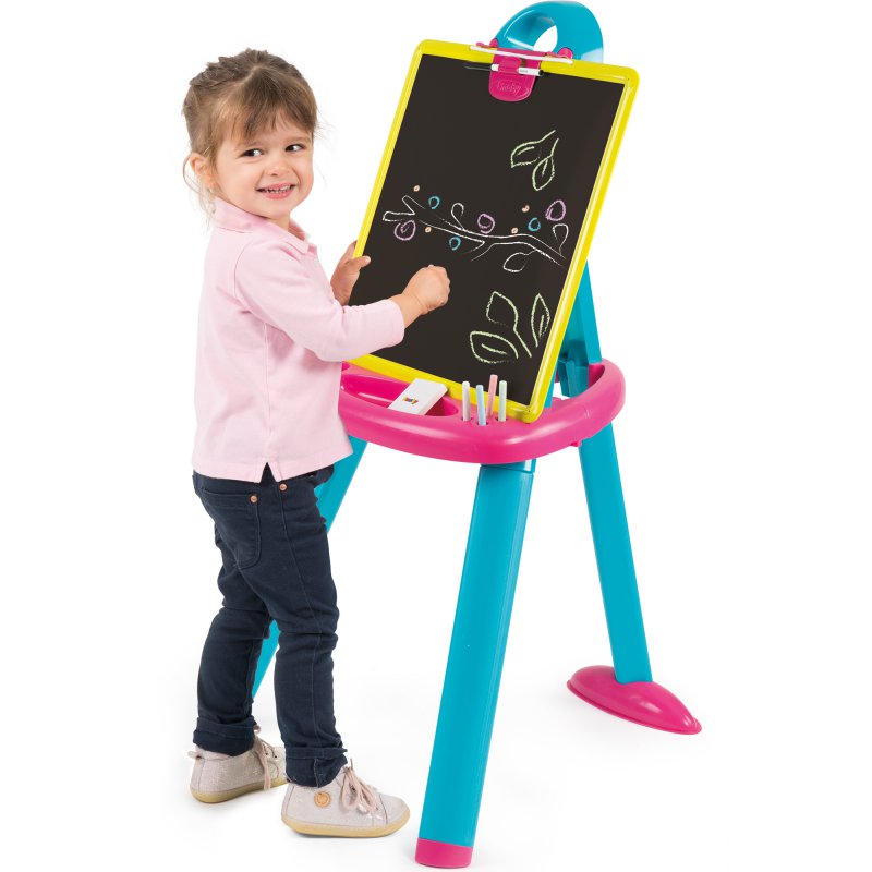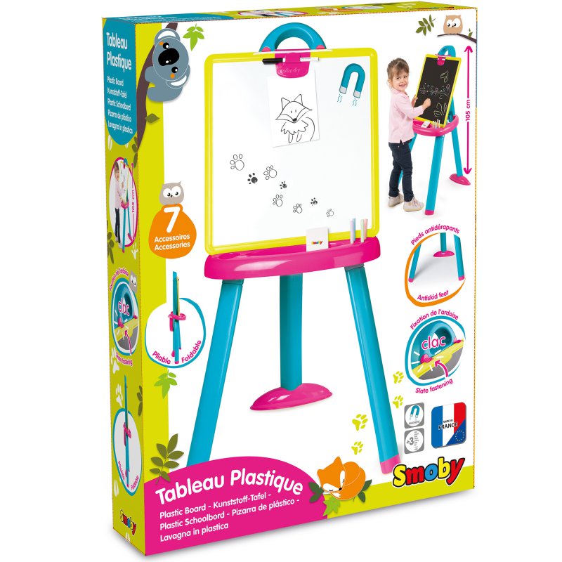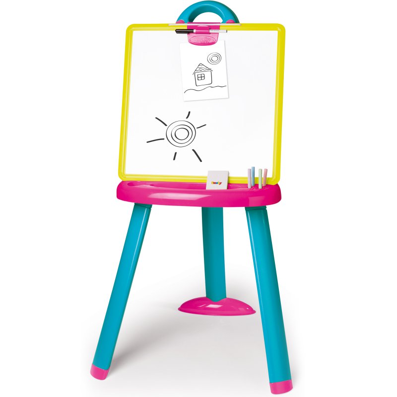 Niezwykle stabilna dwustronna i składana tablica magnetyczna i kredowa, daje mnóstwo radości w trakcie zabawy, inspiruje dzieci i rozwija w nich kreatywność. Tablica wyposażona jest w półeczkę z przegródkami na przybory do rysowania, flamaster i kredę.Jedna z jej stron to magnetyczna tablica, na której dziecko może dowolnie mocować magnetyczne litery, tworząc pierwsze wyrazy, a także pisać i rysować flamastrami. Druga strona to tradycyjna tablica, na której dziecko może pisać i rysować kredą.