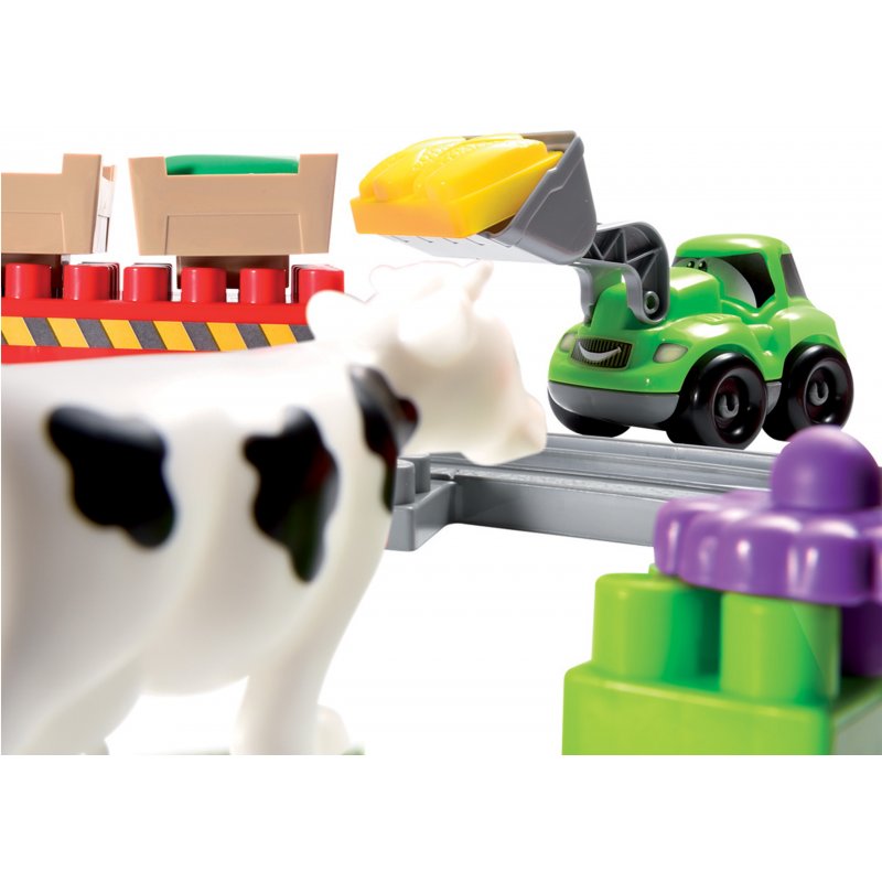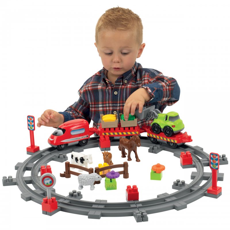 Radosny tor od firmy Ecoiffier w kształcie „0” z wagonikami, zwierzętami, płotkami, klockami, dodatkowymi elementami i koparką w komplecie zapewni mnóstwo radości i zabawy maluchom.