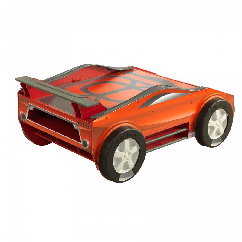 Drewniany samochód z torem wyścigowym został wyposażony w liczne półki z przodu, z tyłu i po bokach, na których dziecko może wyeksponować wszystkie swoje samochodziki. Przemyślana konstrukcja 360° umożliwia zabawę z każdej strony. Mebel posiada tor wyścigowy, po którym pędzić samochodziki. Dodatkową atrakcją jest spojler, który jest częścią toru i pozwala na rozpędzenie autek oraz sekretne schowki na pojazdy znajdujące się w obrotowych kołach. Tor posiada możliwość wydłużenia trasy za pomocą dodatkowych elementów.