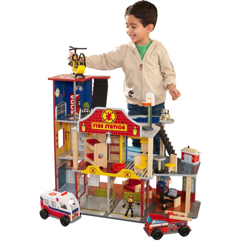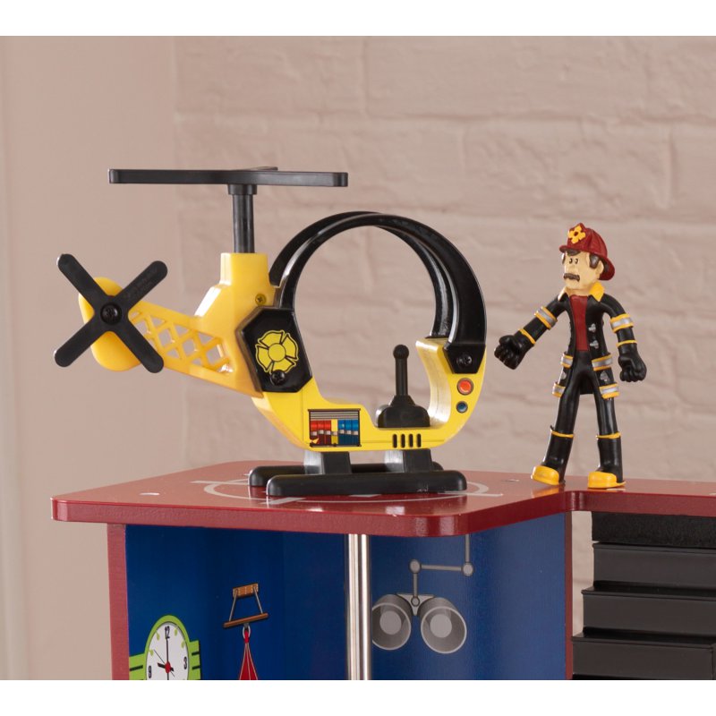 Rewelacyjna 4-poziomowa remiza strażacka renomowanej firmy Kidkraft. Zestaw zawiera: srebrny dzwonek, 22 mebelki, 2 figurki strażaków, lądowisko dla helikopterów i helikopter, garaż z karetką pogotowia i wozem strażackim. Dzięki dużym rozmiarom z garażu może korzystać więcej niż tylko jedno dziecko.