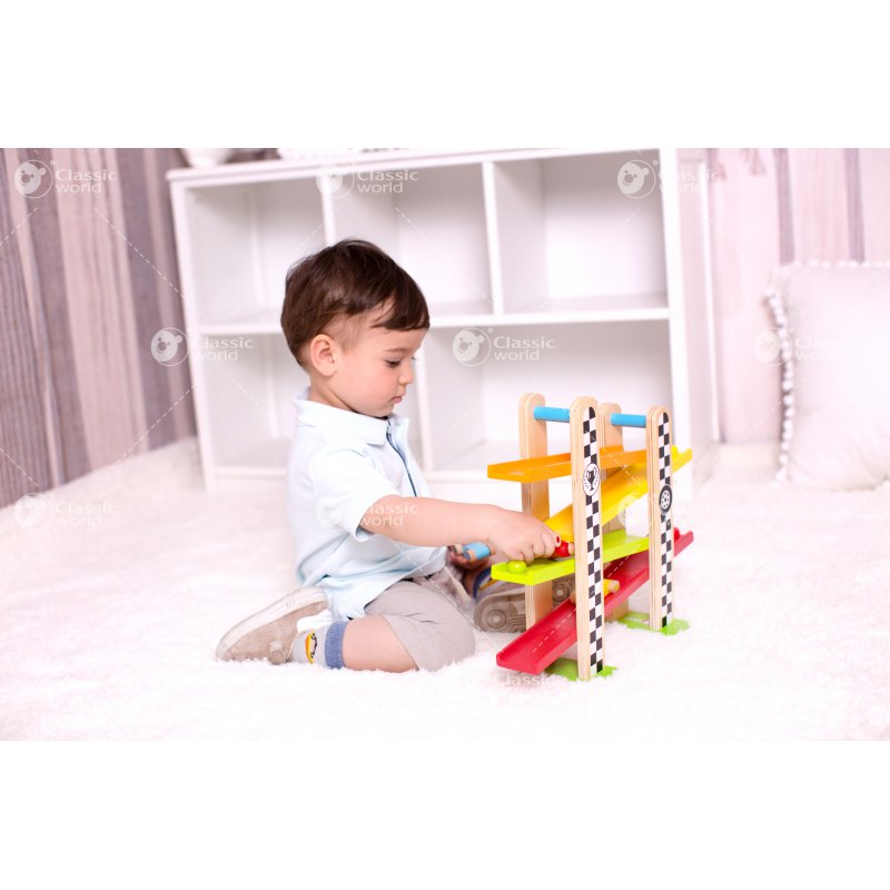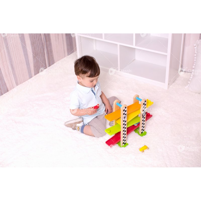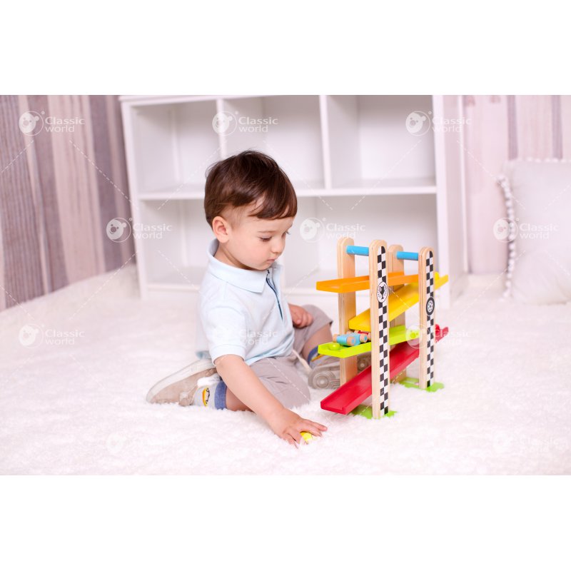 W zestawie znajdziemy 4 kolorowe, drewniane autka oraz śliczny, kolorowy tor - zjeżdżalnię, która przedstawia miejskie zabudowania.