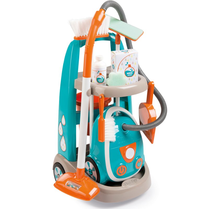 Serwis sprzątający renomowanej francuskiej firmy SMOBY to profesjonalne narzędzie dla każdej małej gospodyni i gospodarza. Na stabilnej podstawie na kółkach umieszczony jest odkurzacz oraz akcesoria takie jak: szczotka, mop płaski, zmiotka, szufelka, kosz na śmieci i imitacje środków czyszczących. Odkurzacz jest niezwykle realistyczny z efektami dźwiękowymi, końcówka w kształcie trójkąta ułatwia dotarcie do trudno dostępnych miejsc, dodatkowo została ona wyposażona w obrotową rolkę z kolorowymi kulkami, które podskakują podczas odkurzania.