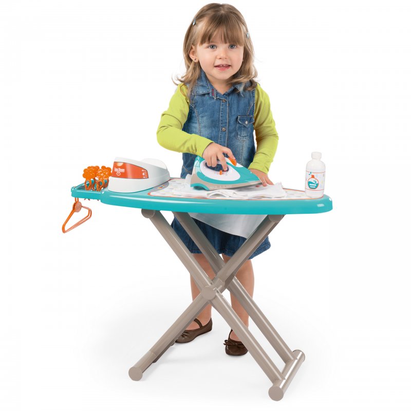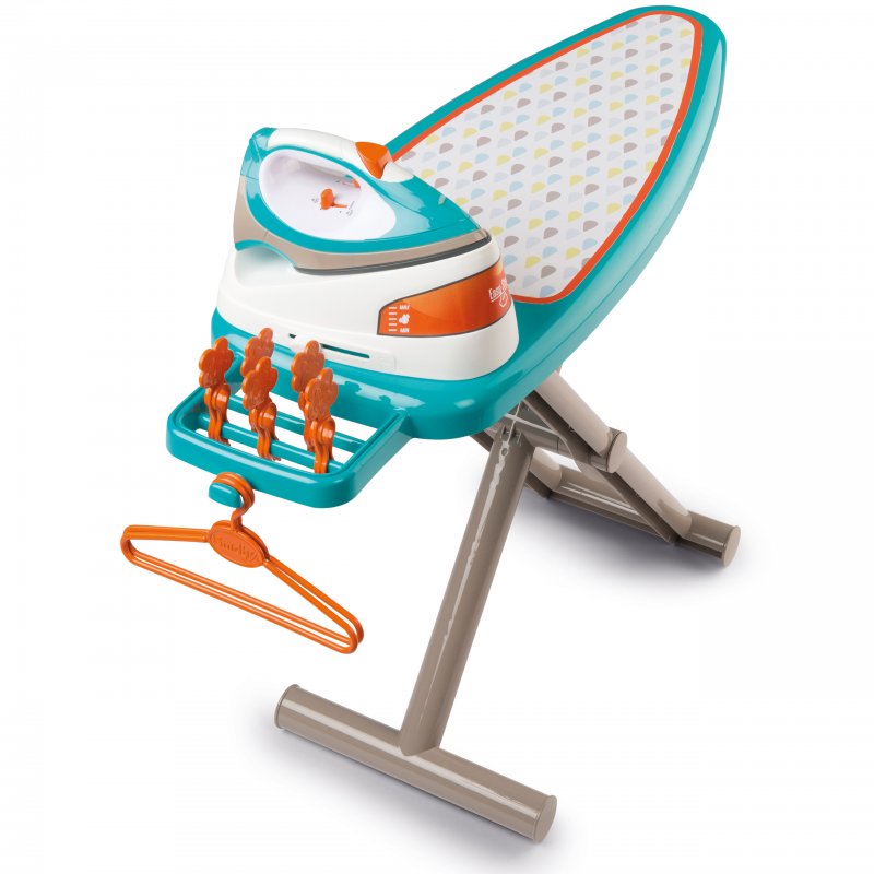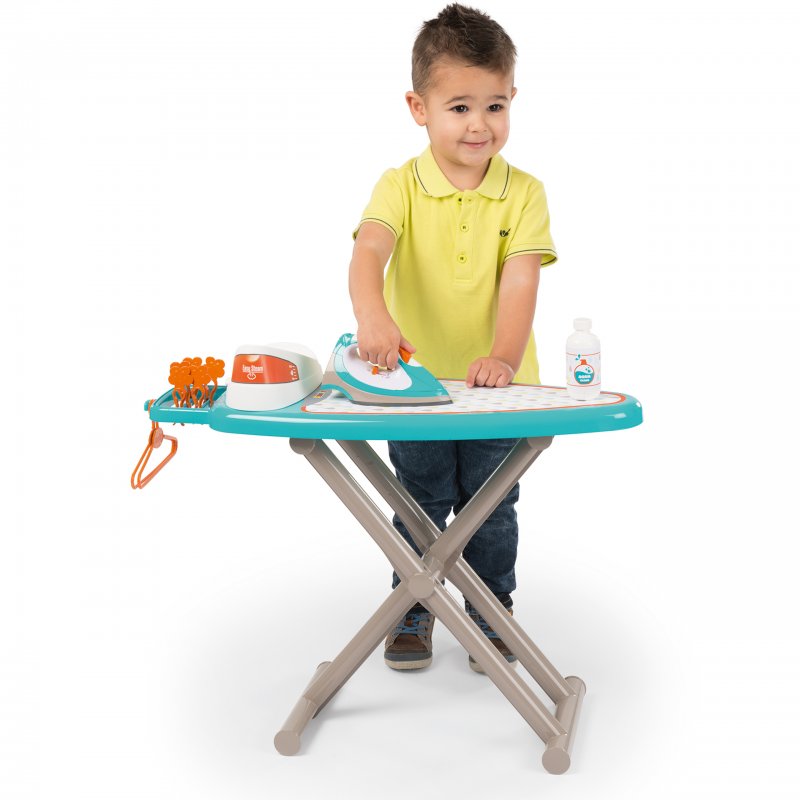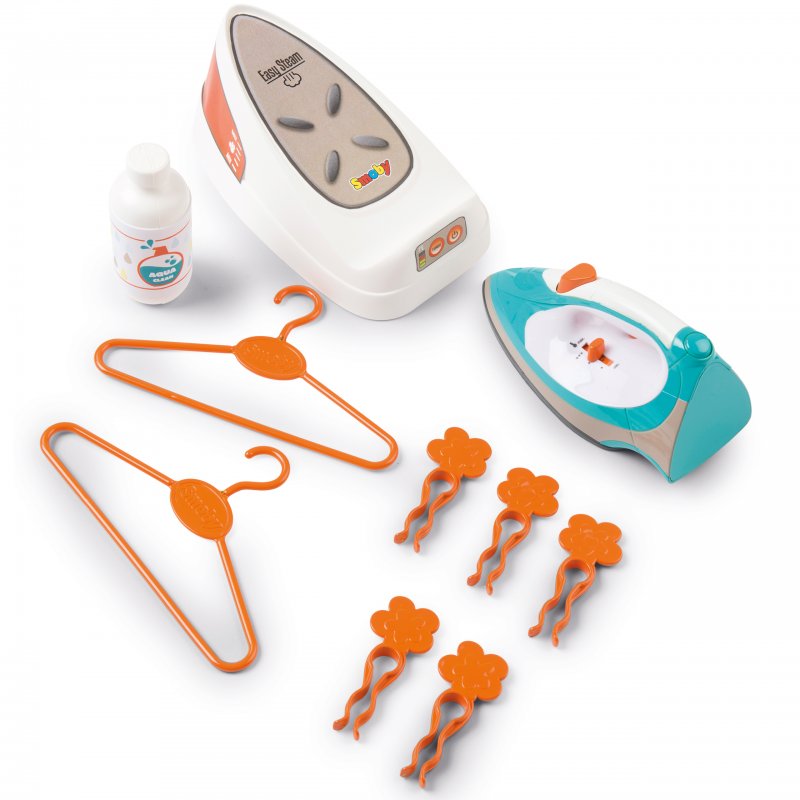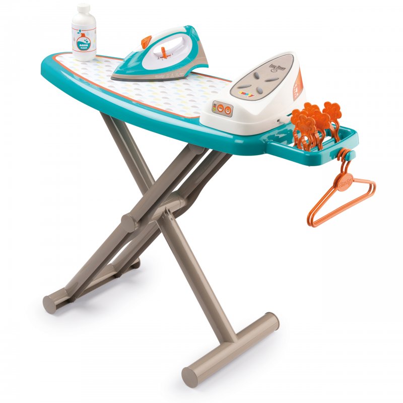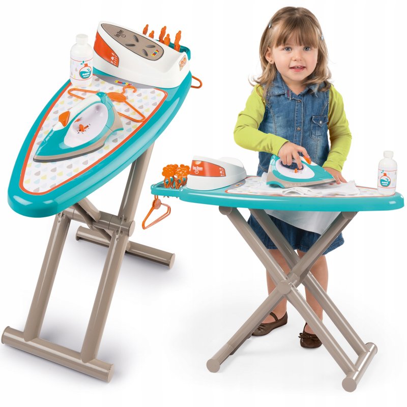 Zestaw do prasowania składa się z funkcjonalnej deski wyposażonej w miejsce na żelazko oraz pręciki na powieszenie "wyprasowanych" ubrań. Deska do prasowania dla dzieci + żelazko z generatorem pary (po naciśnięciu metalowego przycisku słychać dźwięk wydobywającej się pary). W zestawie znajdziemy 10 akcesoriów takich jak: żelazko, stację parową, 2 wieszaczki, 5 klamerek, a także płyn do zraszania tkanin.