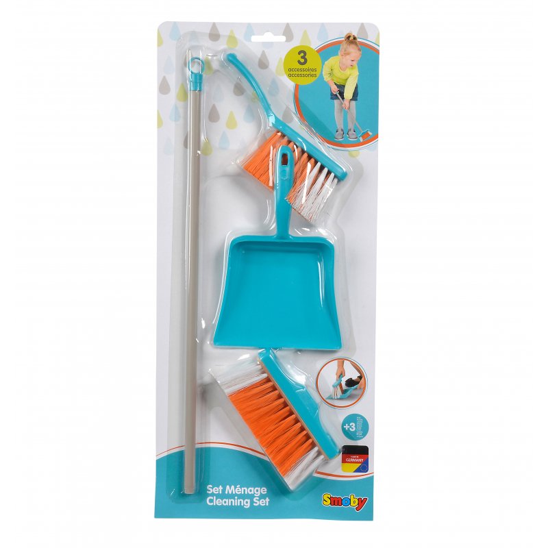 W zestawie znajdziemy 3 akcesoria takie jak szufelka, zmiotka oraz szczotka.