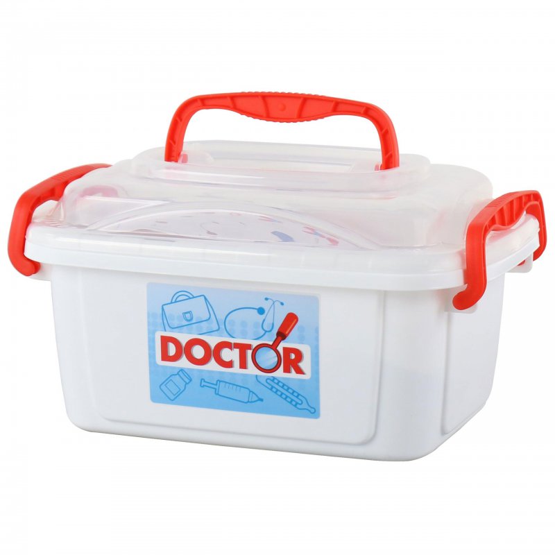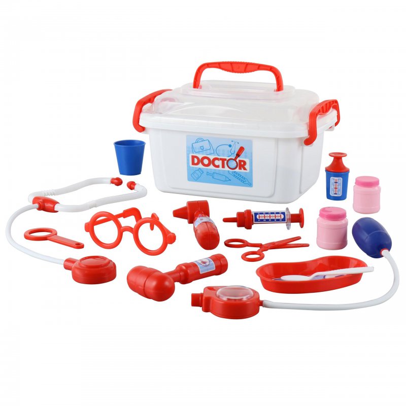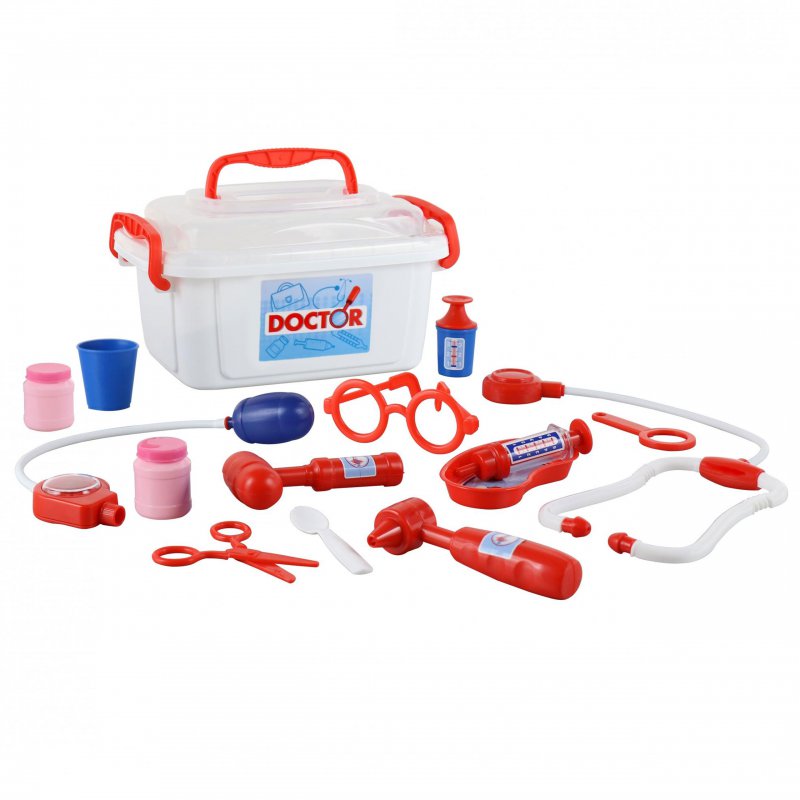 Zestaw w walizeczce o trapezowym kształcie zawiera podstawowe, niezbędne wyposażenie każdego medyka. Czerwona walizeczka wykonana jest z bardzo trwałego tworzywa, posiada wygodny uchwyt do noszenia oraz żółty klips, który zabezpiecza ją przed otwieraniem się. Ten zestaw zawiera aż 10 elementów. Wszystkie są oczywiście bezpieczne dla dzieci i proste w użyciu.