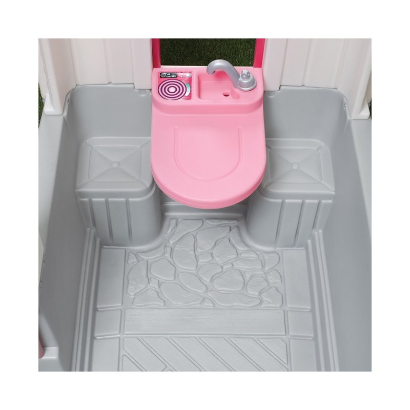 W środku domu znajduje się zlew, kuchenka, stoliczek oraz dwa siedziska z oparciem przytwierdzone na stałe.