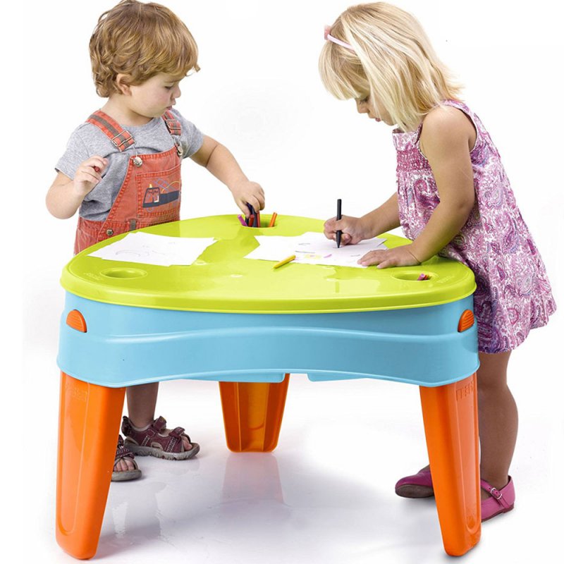 Wyspa zabaw to wspaniała zabawka w postaci stolika, który można przekształcić w piaskownię i zbiornik wodny. W zestawie znajdują się akcesoria do zabawy takie jak wodny młynek, grabki, łopatka, foremka i dwie łódeczki. Pokrywa stołu pełni też funkcję zabezpieczającą dla piasku i wody znajdujących się pod spodem. Stabilna konstrukcja zapewnia bezpieczną zabawę. Stolik piaskownica jest niezwykle łatwa w montażu. Całość wykonana jest z kolorowego tworzywa odpornego na promieniowanie słoneczne i temperaturę.