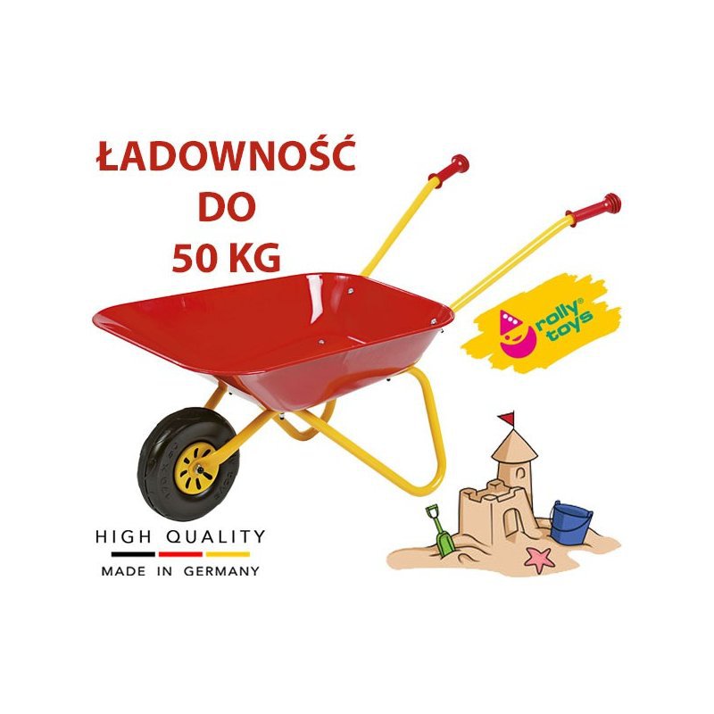 Taczka dla dzieci - Rolly Toys którą można wozić zarówno piasek, jak i klocki a nawet coś znacznie cięższego. Według producenta ładowność taczki wynosi aż 50 kg. W calosci wykonana z metalu dzięki czemu jest bardzo wytrzymała.