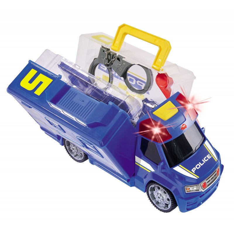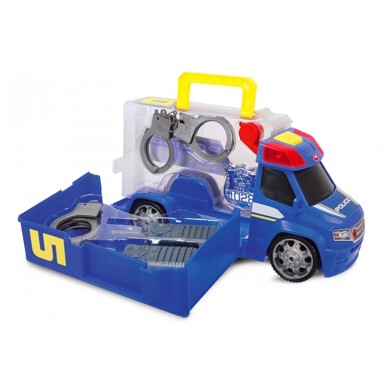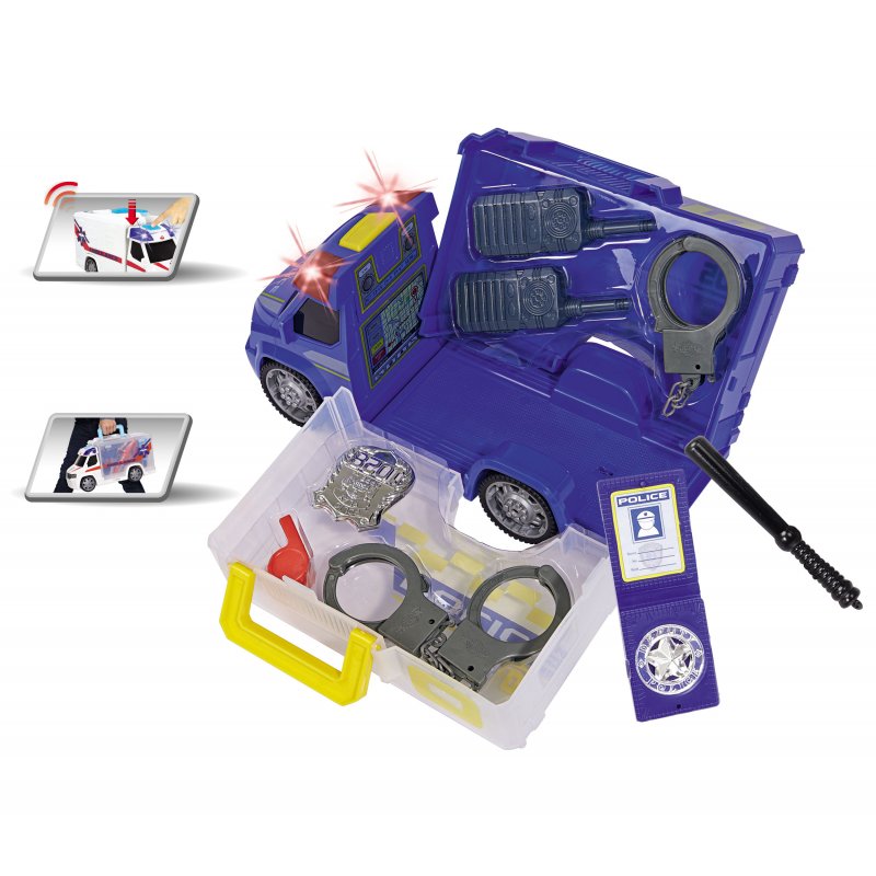 Samochód policyjny posiadający wolne koła z dźwiękiem i efektami świetlnymi. Akcesoria przechowywane w przyczepie, która otwiera się jak walizka.Zaprojektowany przez cenionego producenta zabawek dla dzieci niemiecka firmę Dickie