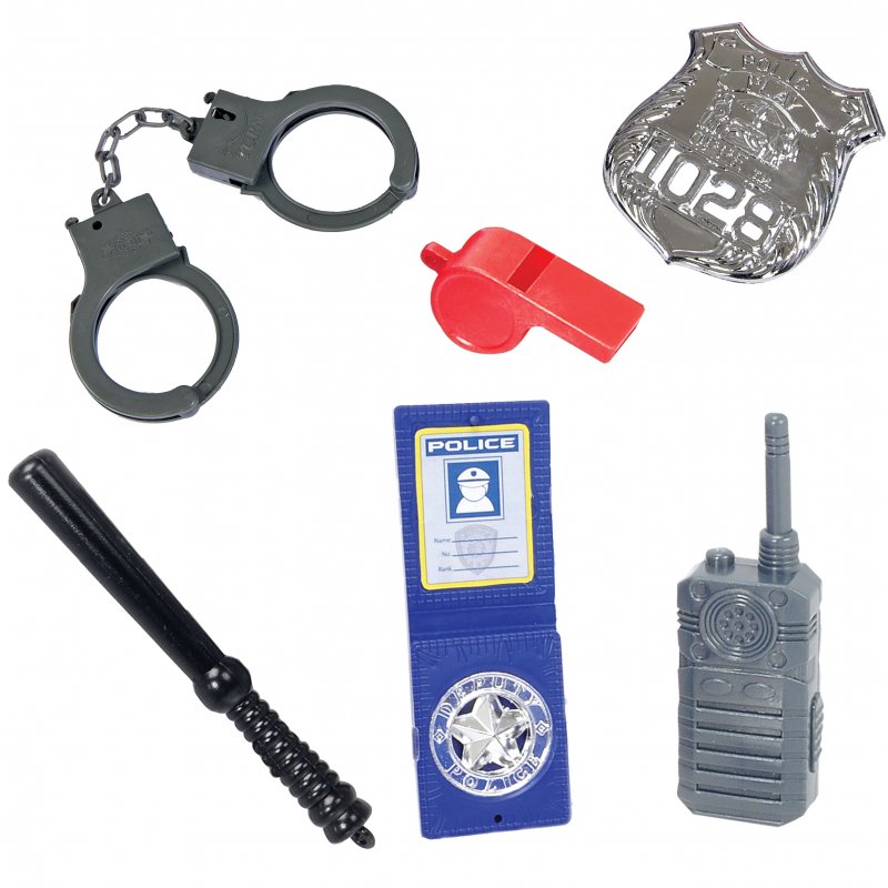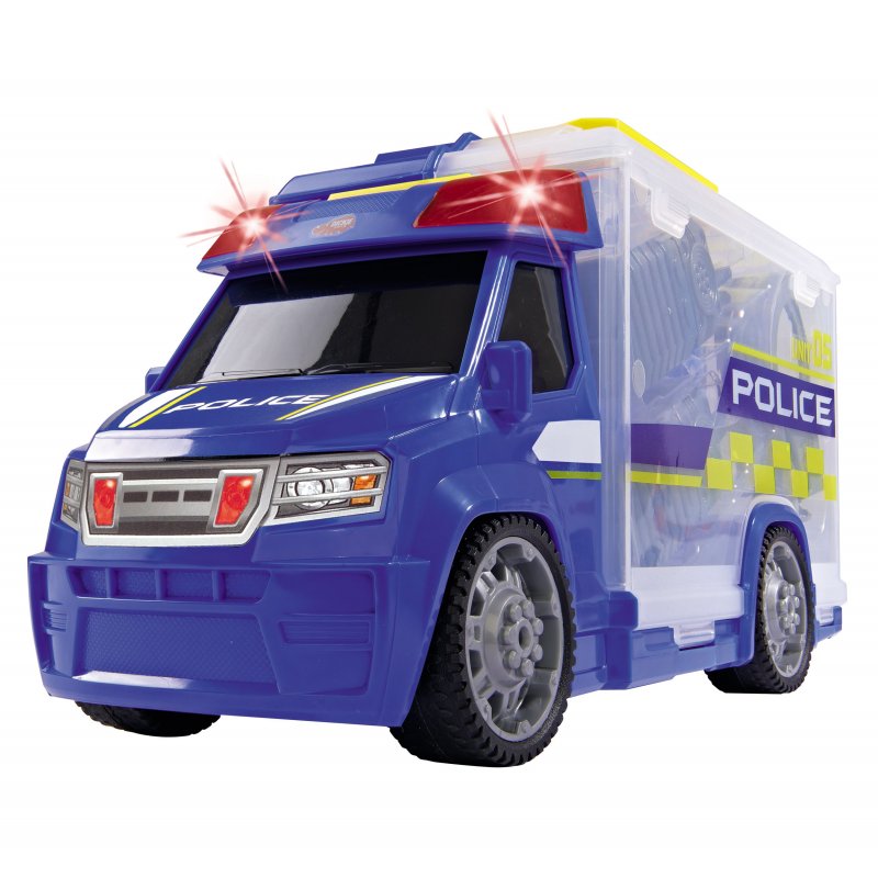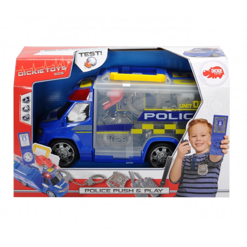 Samochód policyjny posiadający wolne koła z dźwiękiem i efektami świetlnymi. Akcesoria przechowywane w przyczepie, która otwiera się jak walizka. Akcesoria to np. kajdanek, walkie-talkie, odznaka, gwizdek. Długość samochód całkowita 33 cm.