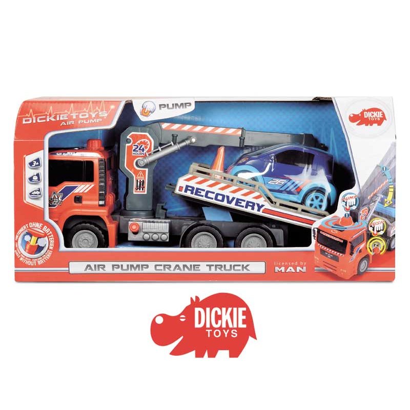Dźwig z pompką firmy Dickie to świetna propozycja dla twojego dziecka. Ramie dźwigu jest obsługiwane za pomocą pompki i opuszcza się je poprzez przycisk, umieszczony na bocznej ścianie pojazdu..
