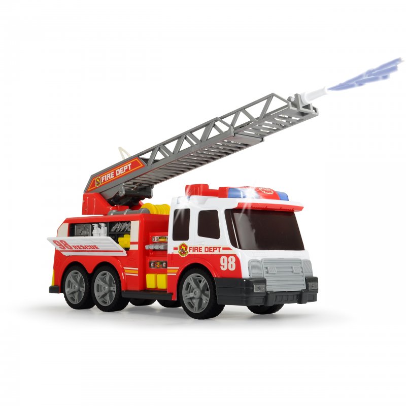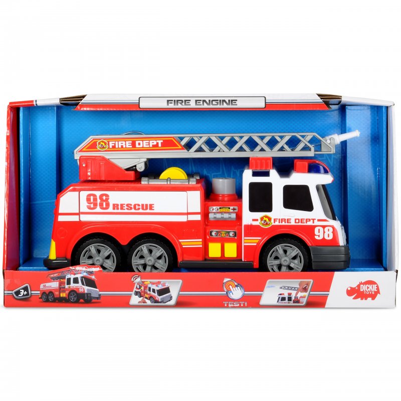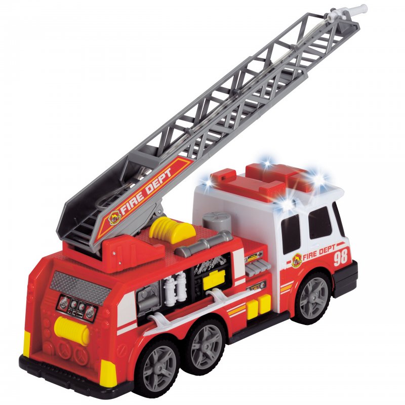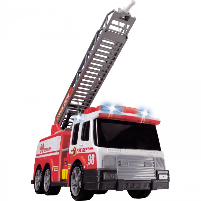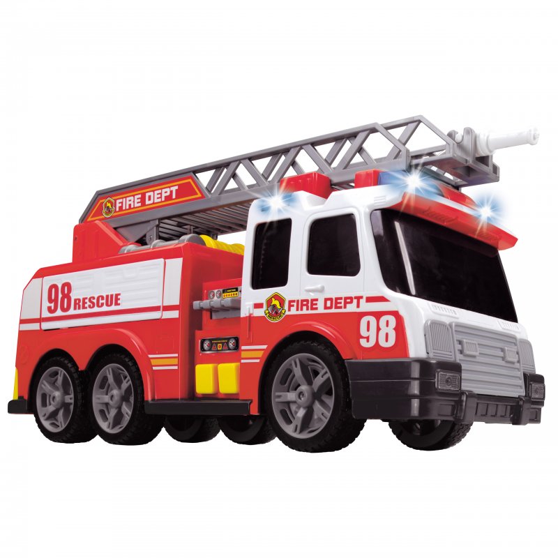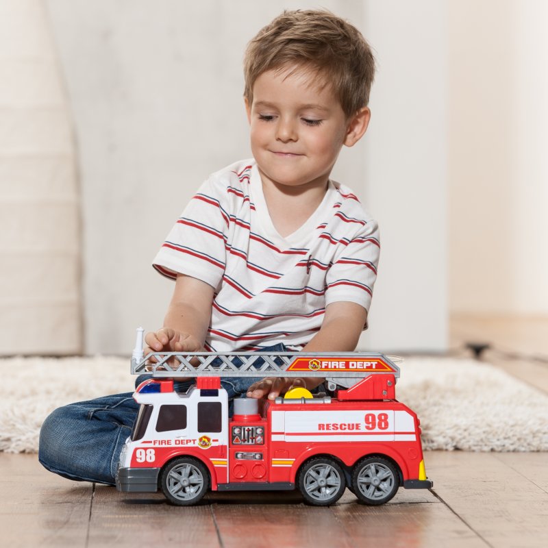 Gigantyczna Straż Pożarna niemieckiej firmy Dickie,wprowadzi małego strażaka w świat wielkich przygód i niezapomnianych wrażeń. Samochód do złudzenia przypomina te jeżdżące po naszych ulicach. Dzieciaki z wypiekami na twarzy obserwują świat tym bardziej jeśli chodzi o podobne pojazdy, dlatego niewątpliwie przyniesie on wiele radości każdemu maluchowi. Wspaniały zestaw dla małego strażaka na służbie: straż pożarna, wóz bojowy z rozsuwaną drabiną i sikawką! Ponad to pojazd miga czerwonymi światłami i wydaje realistyczne dźwięki sygnału straży oraz odpalanego silnika.Wspaniały zestaw dla małego strażaka na służbie: strażacki wóz bojowy z rozsuwaną drabiną i sikawką!