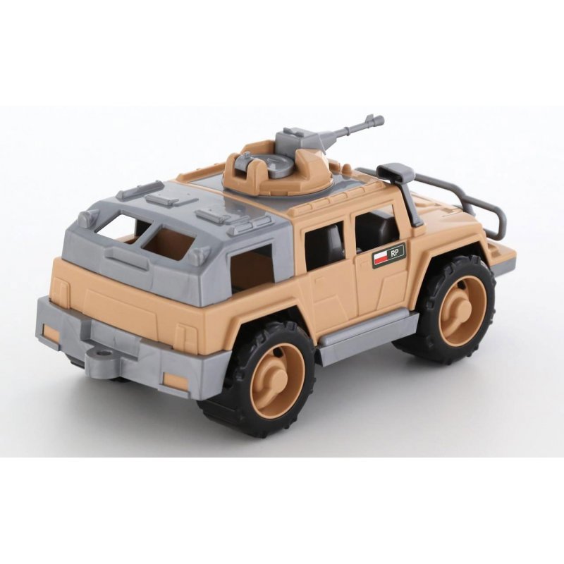 Samochód terenowy Obrońca Safari w kolorze piaskowym wygląda niezwykle realistycznie. Pojazd wyposażony w duże, szerokie koła, dzięki którym będzie mógł przemieszczać się w tajemnicze zakątki sawanny. Dodatkowo terenówka posiada obrotowe działo, umiejscowione na dachu, z miejscem dla jednego strzelnika co z pewnością uatrakcyjni zabawę. Pojazd na dachu posiada również otwierany właz oraz ruchome działo.