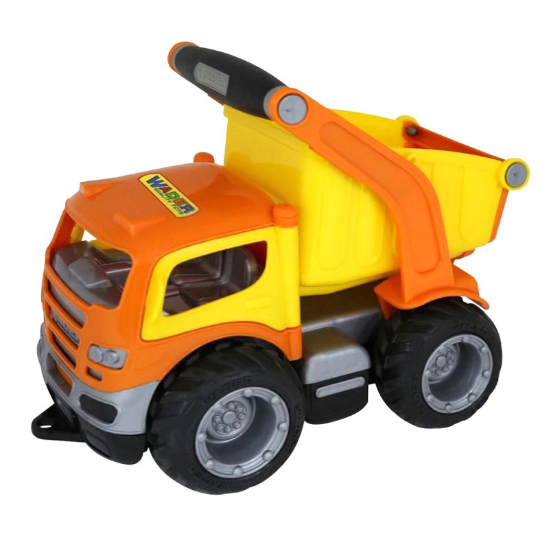 Ciężarówka wywrotka z serii GripTruck od firmy Wader QT, cenionego producenta zabawek dla dzieci, posiada gumowe koła.