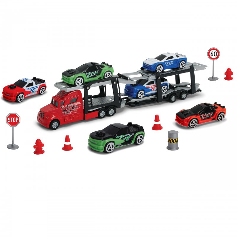 Czerwona ciężarówka z naczepą do przewozu aut może przewieźć 4 pojazdy na raz. Laweta posiada dwupoziomową przyczepę. Na każdym poziomie zmieszczą się dwa auta. W zestawie 6 pojazdów do przewożenia.