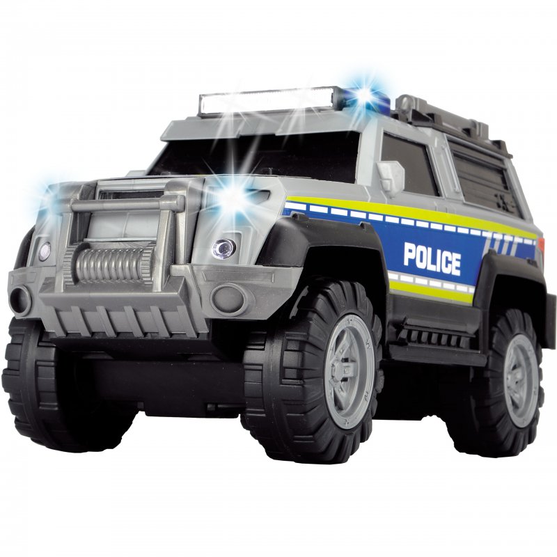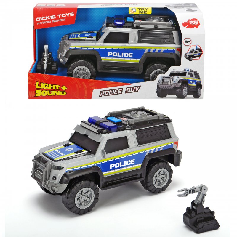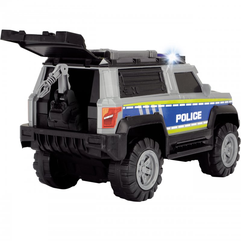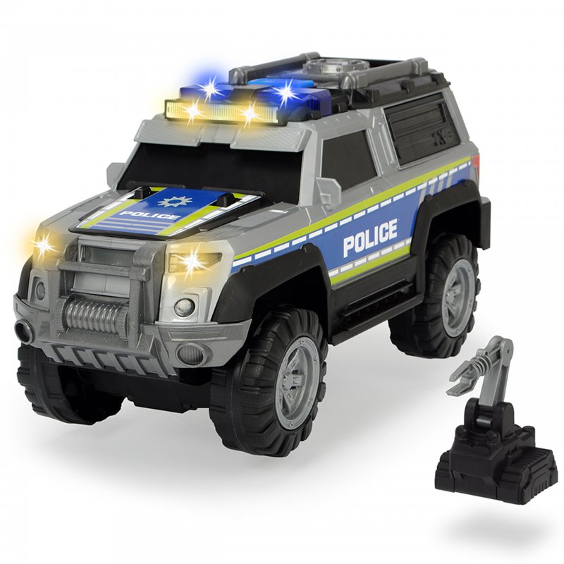 Samochód policyjny posiadający wolne koła z dźwiękiem i efektami świetlnymi. Akcesoria przechowywane w przyczepie, która otwiera się jak walizka.Zaprojektowany przez cenionego producenta zabawek dla dzieci niemiecka firmę Dickie