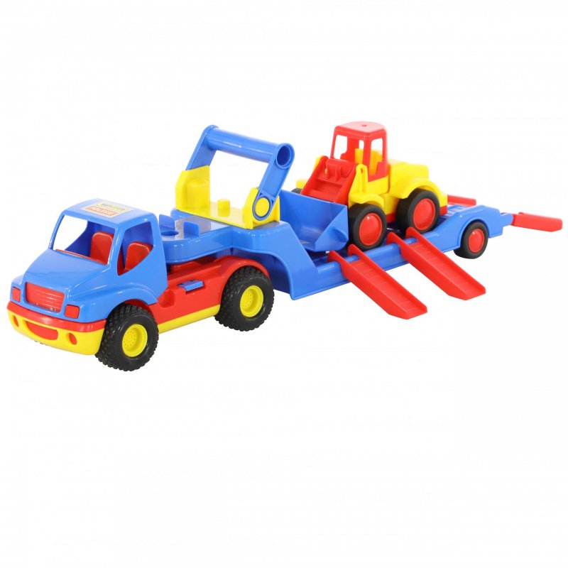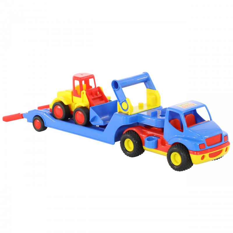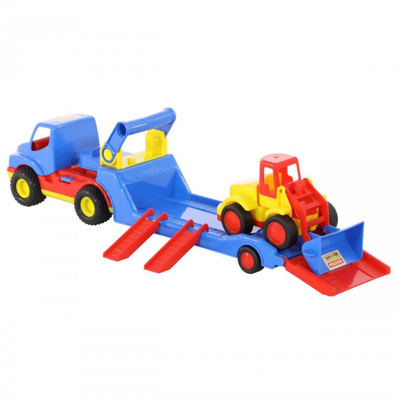 56-centymetrowa ciężarówka z gumowymi kołami, odczepianą naczepą,ruchomym podjazdem i dodatkowym spychaczem. Posiada ona wygodny uchwyt do przenoszenia.