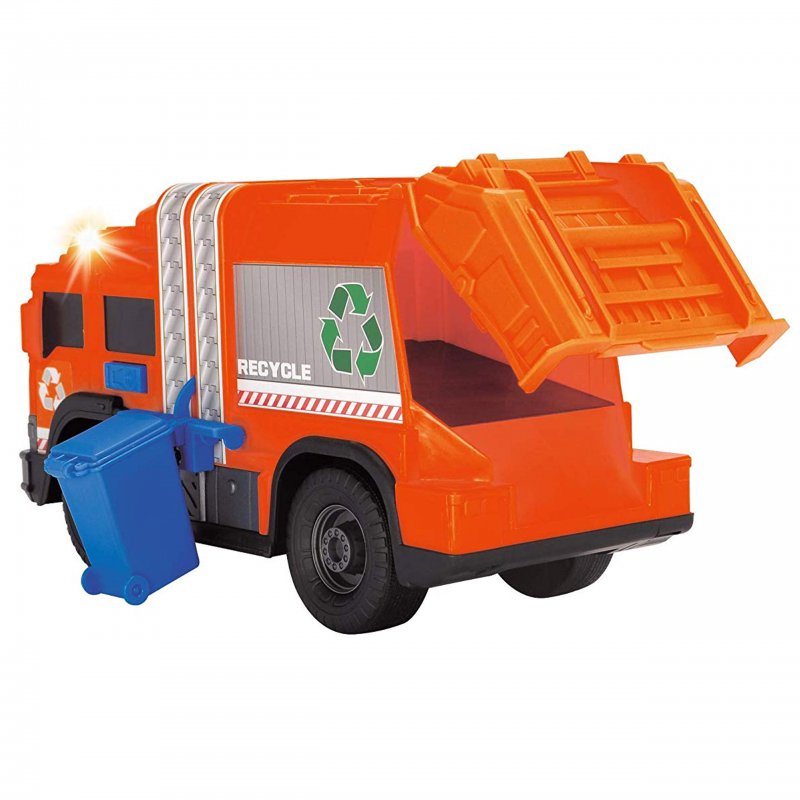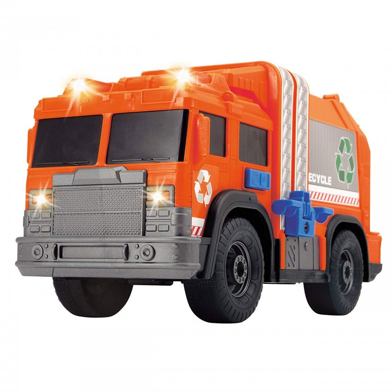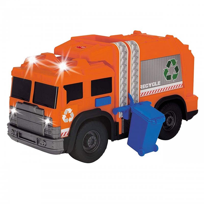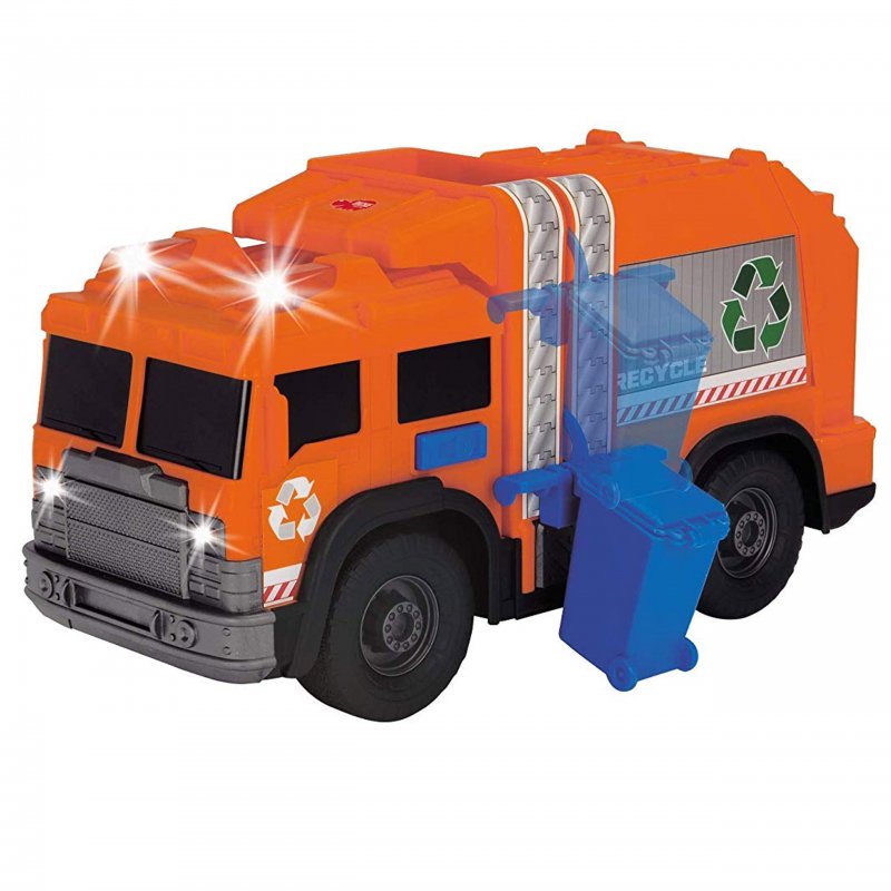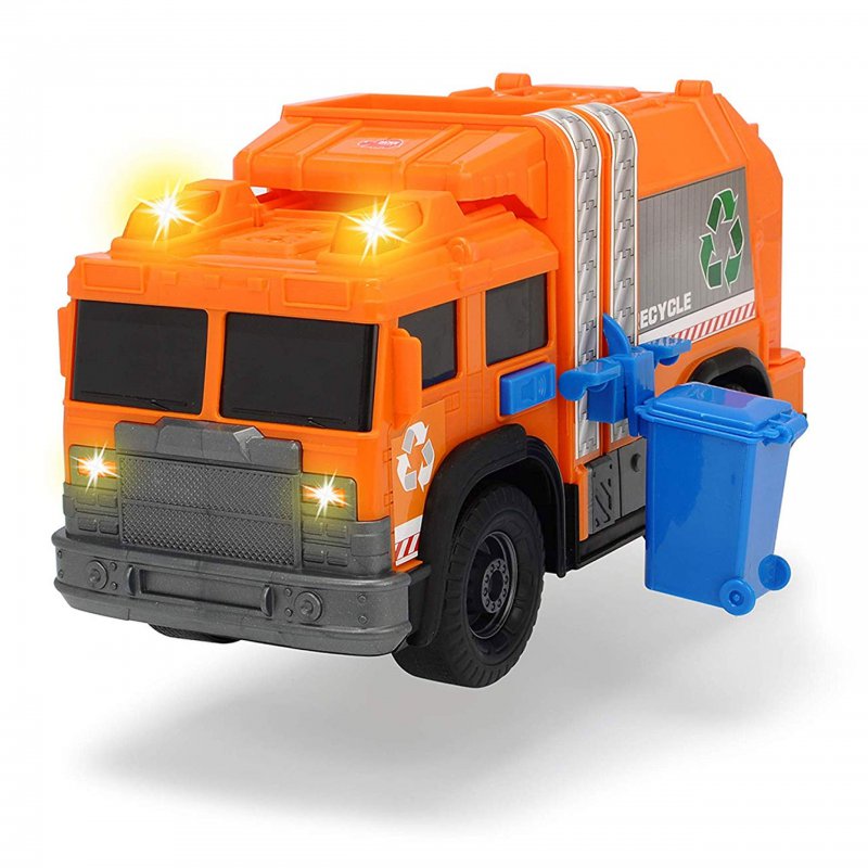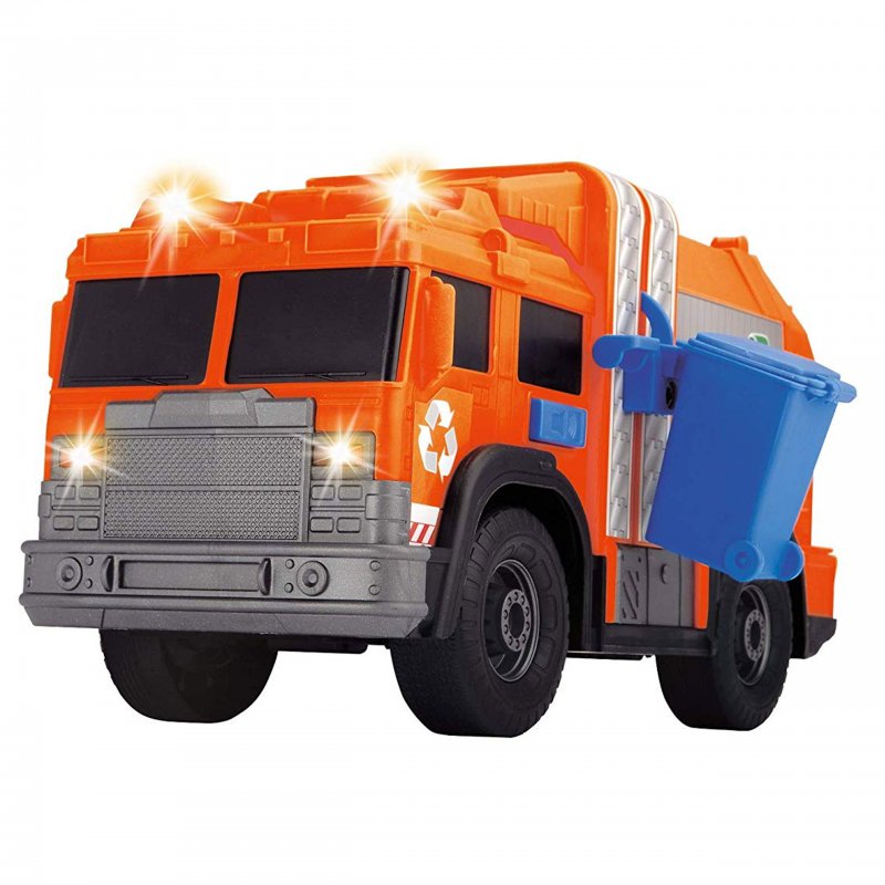 Śmieciarka pomarańczowo-czarna sprawi radość każdemu chłopcu, niezależnie od wieku. Została wyposażona w efekty świetlne i dźwięki. Dodatkowym elementem zestawu jest pojemnik, który może być podnoszony i opuszczany. Tylna klapa ciężarówki jest otwierana.