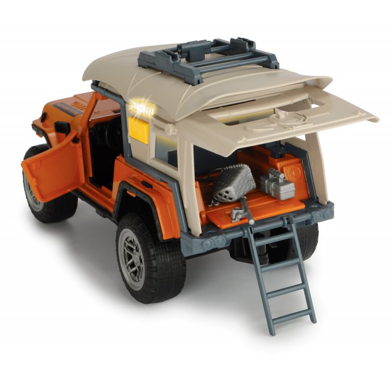 Zestaw Prawdziwy Camping Samochód Jeep + Akcesoria 3835004. Pora na wycieczkę nad rzekę lub jezioro. Pojazd ma realistyczne detale m.in. bagażnik na dachu z dołączonym kajakiem z wiosłami. 11-częściowy zestaw składa się z pomarańczowo - beżowego Jeepa, w pełni ruchomej figurki i innych akcesoriów. Jeep ma otwierane drzwi i tylną klapę bagażnika, mierzy całkowitą długość około 24 cm. Posiada efekty świetlne: mrugające światła oraz efekty dźwiękowe: odgłosy otoczenia. Istnieje możliwość wyłączenia efektów dźwiękowych, wystarczy przytrzymać przycisk przez 5 sekund. Zestaw prawdziwy camping jest idealny dla dzieci w wieku od 3 lat, oferuje dużo zabawy.