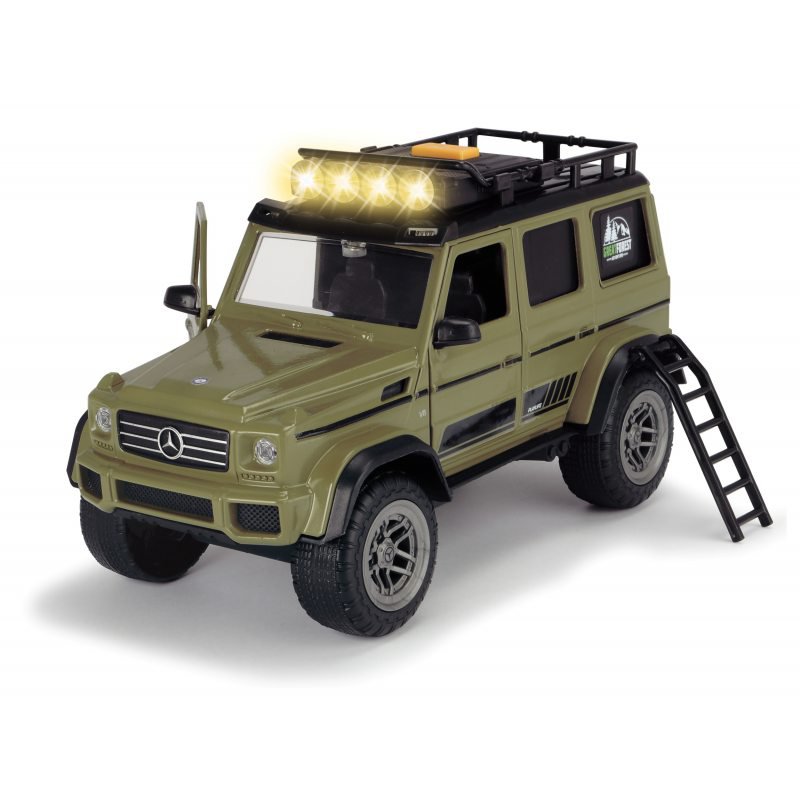 Zestaw Wyprawa na łowy Samochód Mercedes-Benz + Akcesoria Czas na polowanie, zabierz ze sobą psa myśliwskiego i wyruszcie razem na przygodę w lesie. 11-częściowy zestaw składa się z samochodu terenowego, w pełni ruchomej figurki i innych akcesoriów. Samochód ma otwierane drzwi boczne i tylne bagażnika, odczepianą drabinkę, mierzy całkowitą długość około 23 cm.