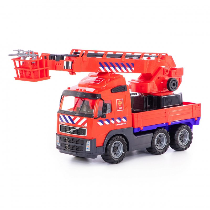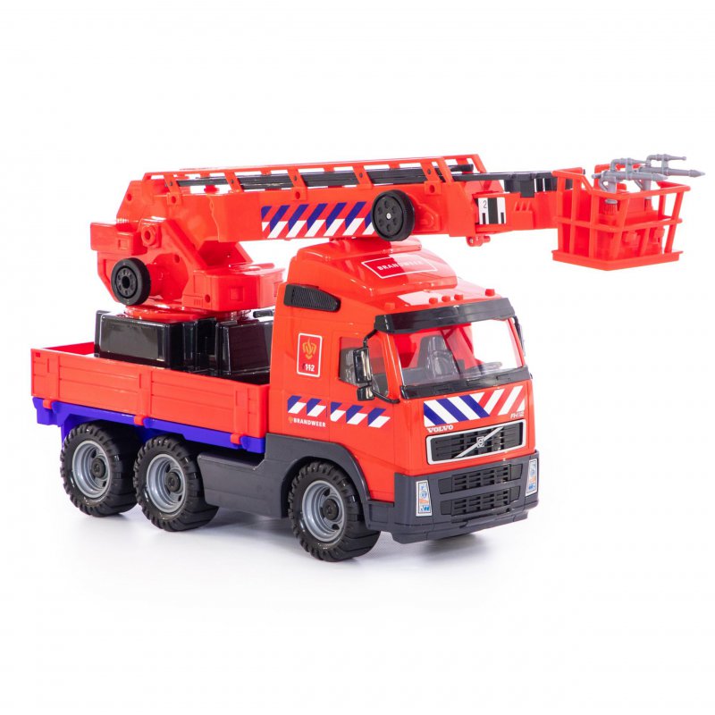 Dźwig VOLVO to duży pojazd wyposażony w szerokie koła połączone metalowymi osiami. Ich struktura nie jest gładka, co ułatwia jazdę po nierównych powierzchniach. Na naczepie umieszczono wysięgnik, który obraca się wokół własnej osi. Otwierane są również burty pojazdu. Dziecko może naśladować pracę prawdziwego pojazdu. Kabina kierowcy jest oszklona. Użyto w tym celu grubego, przezroczystego plastiku.