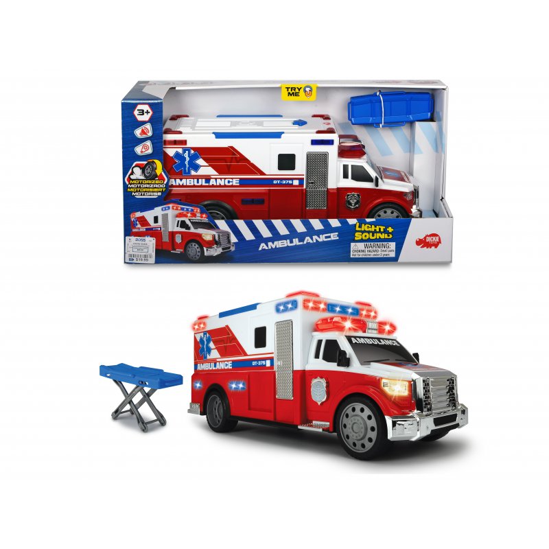 Pojazd A.S. Ambulans, 33 cm Pojazd Ambulans z automatyczną jazdą do przodu, śwatło i dźwięk, otwierane boczne drzwi oraz nosze.