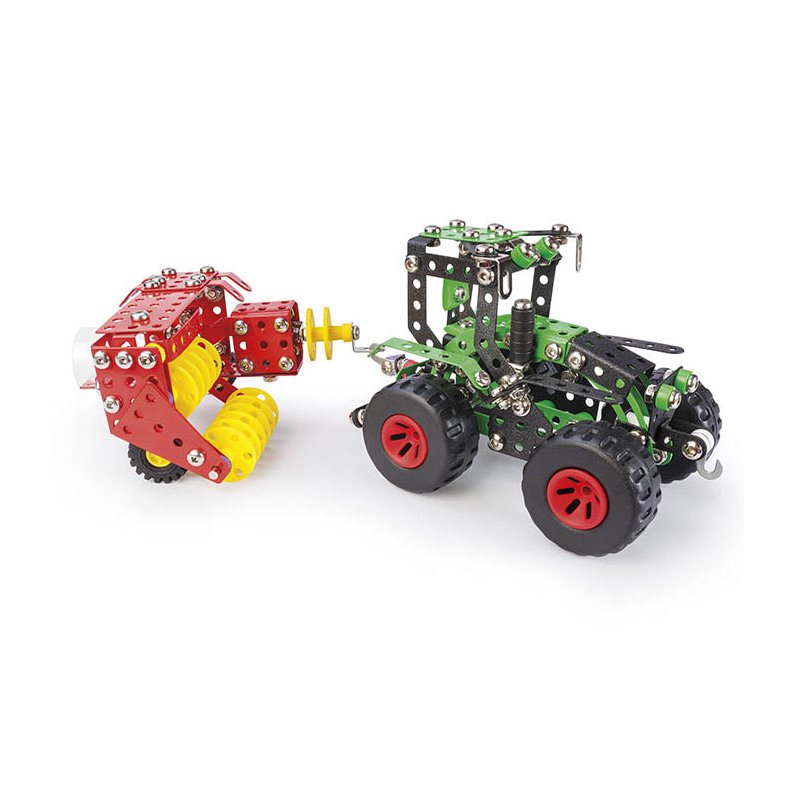 Zestaw składający się z traktora oraz prasy do siana. Produkt wchodzi w skład serii maszyny rolnicze. Zabawka może służyć jako pojedynczy model do zabawy, albo stać się podstawą do zbudowania całego parku maszynowego niezbędnego do pracy na gospodarstwie.