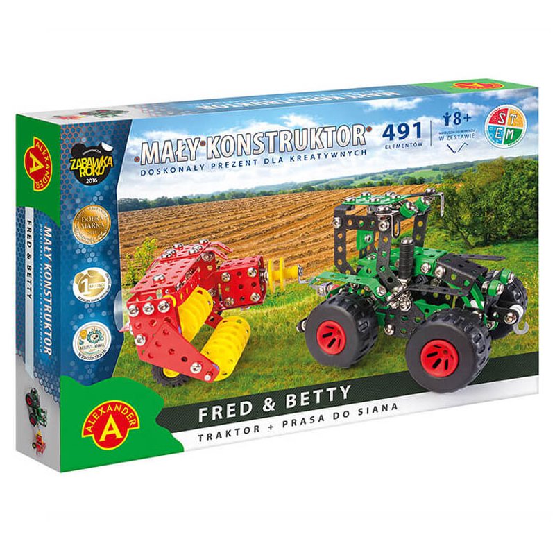 Zestaw składający się z traktora oraz prasy do siana. Produkt wchodzi w skład serii maszyny rolnicze. Zabawka może służyć jako pojedynczy model do zabawy, albo stać się podstawą do zbudowania całego parku maszynowego niezbędnego do pracy na gospodarstwie. W serii ukazały się następujące maszyny wspomagające, które można doczepić do traktora: Emily (talerzówka), Stinky (rozrzutnik obornika), Jacob (opryskiwacz), Helen (zgrabiarka do siana), Wiliam (pług obrotowy). Mały Konstruktor to seria zabawek do samodzielnego montażu, rozwijająca zdolności manualne oraz wyobraźnię przestrzenną. Każdy model składa się z elementów metalowych o różnej wielkości i kształtach, a także jest wzbogacony kolorowymi elementami z tworzyw sztucznych. Dzięki dołączonemu zestawowi narzędzi, można zbudować wyjątkowy pojazd zgodnie ze wskazaniami instrukcji lub wedle własnej wyobraźni. To idealny wstęp do rozbudzenia w dziecku pasji inżyniera. Zabawka która łączy pokolenia, zachęcając do wspólnego majsterkowania.