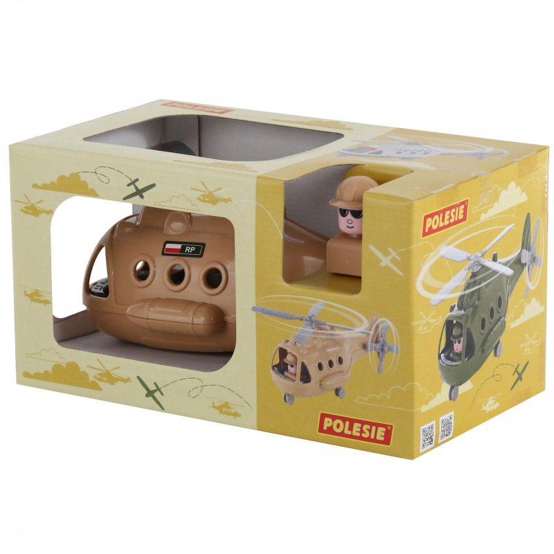 Śmigłowiec wojskowy, który sprawi wiele radości każdemu dziecku, które lubi się bawić w pilota lub naśladować żołnierza. W zestawie znajduje się helikopter z ruchomym śmigłem i ruchomymi kołami oraz wyjmowana figurka pilota/żołnierza. Zabawka wykonana z ogromną starannością, z najwyższej jakości materiałów.