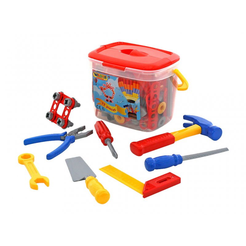 Liczne akcesoria dla małego mechanika takie jak młotek, miara, śrubokręt, brzeszczot, klucz, kombinerki, szpachelka niezbędne w każdym warsztacie. Do tego 65 elementów konstrukcyjnych, dzięki którym mały konstruktor może stworzyć wiele ciekawych urządzeń. Realistyczne wyposażenie na pewno zapewni długą wspaniałą zabawę. Zestaw narzędzi w poręcznym pojemniku.