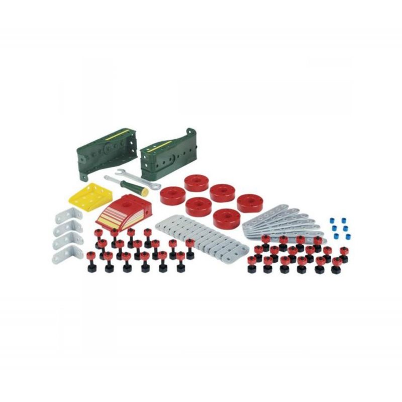 Dodatkowo w zestawie znajdują się śrubki, płytki z otworami, rama dla pojazdów, kółka, klucz oraz śrubokręt.