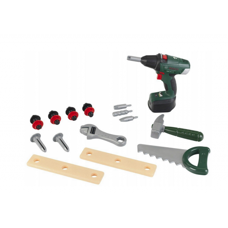 Wśród narzędzi dzieci odnajdą bezprzewodową wkrętarko-wiertarkę na baterie z czterema wymiennymi końcówkami. Wkrętarko-wiertarka doskonale naśladuje prawdziwe urządzenie Bosch, dzięki dźwiękom oraz obrotowemu wkrętowi.