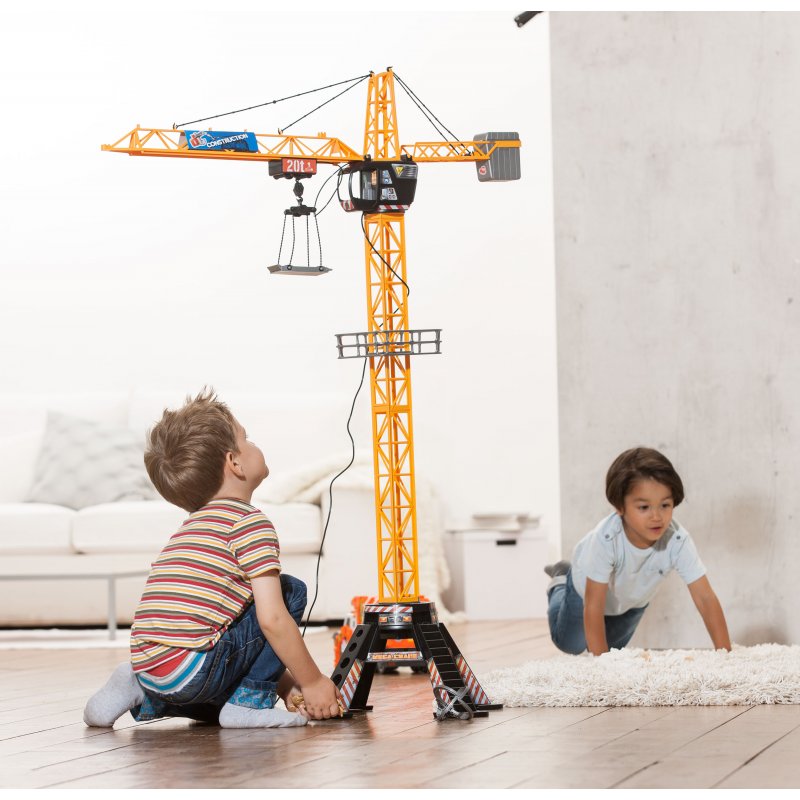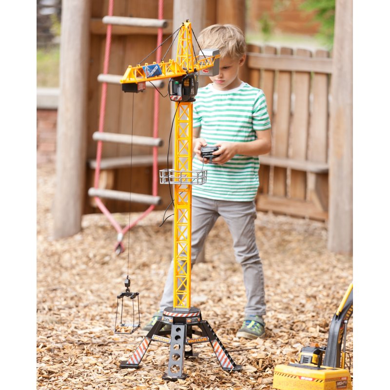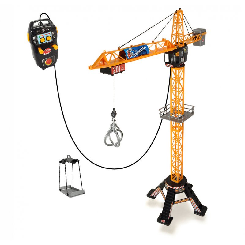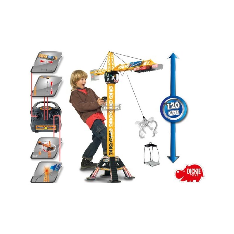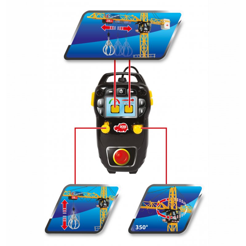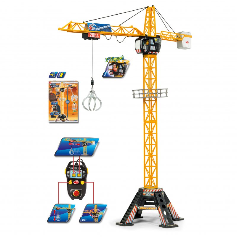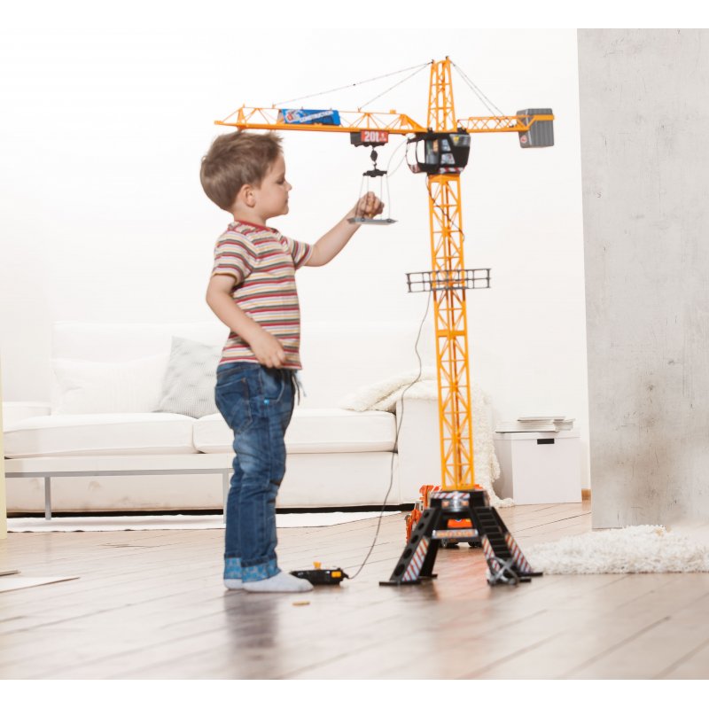 Zdalnie sterowany dźwig posiada czteroramienną podstawę zapewniającą stabilność podczas zabawy, kabinę, która pomieści figurkę budowlańca (zestaw nie zawiera figurki) oraz ruchome ramię służące do podnoszenia różnego typu ładunków. Dźwig posiada również kosz ładowniczy i platformę. Za pomocą pilota można podnosić i opuszczać ładunek oraz przemieszczać go wzdłuż ramienia dźwigu. Ramieniem dźwigu poprzez nadajnik można obracać aż o 350 stopni.