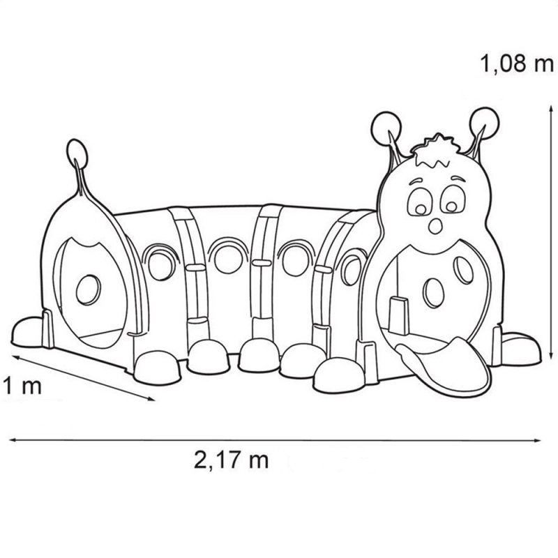 Kolorowy plac zabaw dla dzieci w kształcie uśmiechniętej gąsienicy. Tunel składa się z kolorowych modułów połączonych ze sobą - istnieje możliwość dokupienia dodatkowych modułów aby gąsienica była jeszcze dłuższa. Powłoka anty UV - nie zmienia kolorów pod wpływam działania promieni słonecznych.
