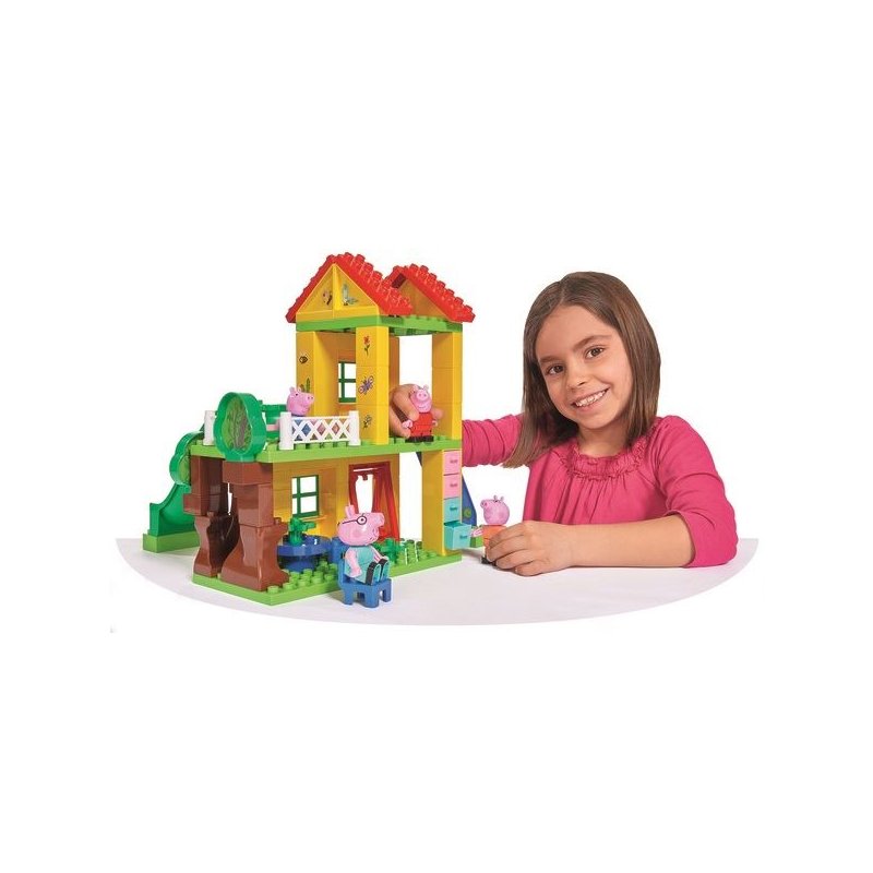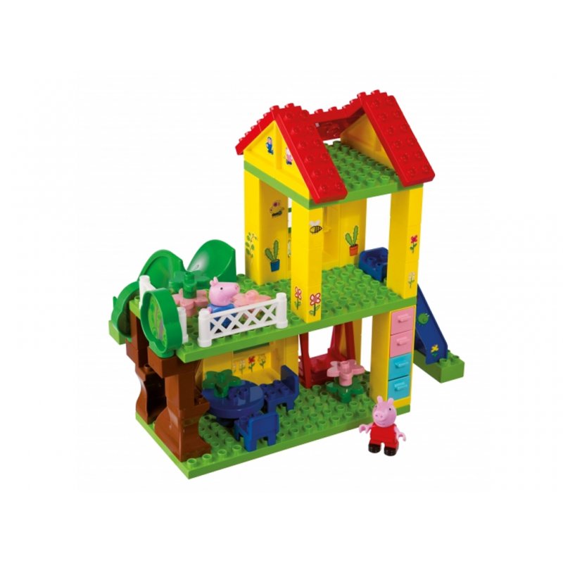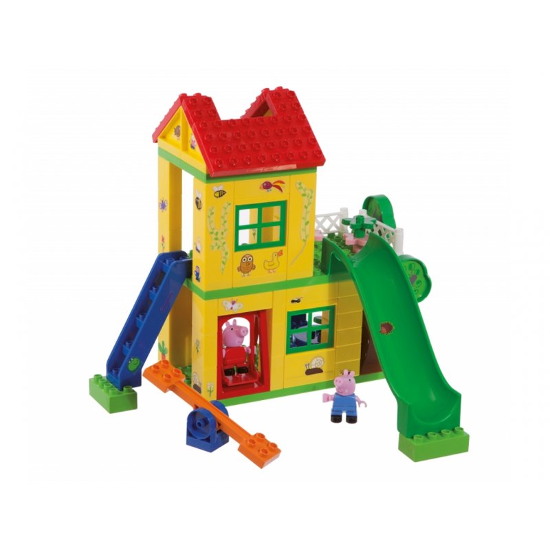 Klocki Plac Zabaw z motywem uroczej ulubienicy wszystkich dzieci Świnki Peppy, od firmy BIG,renomowanego producenta zabawek dla dzieci, to idealny pomysł na prezent. Na dwóch poziomach domku każdy znajdzie coś dla siebie. W zestawie znajduje się również drabinka, zjeżdżalnia a nawet dwie huśtawki. Śliczny domek ozdobimy jest uroczymi naklejkami a jeden z filarów domku ma kilka szufladek na skarby Peppy i jej braciszka George'a. Po męczącej zabawie Nasi bohaterowie odpoczną przy stoliku z krzesełkami/